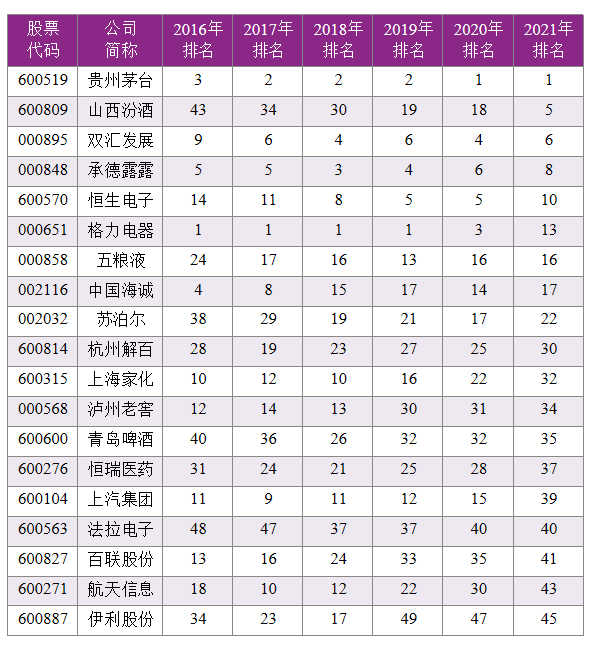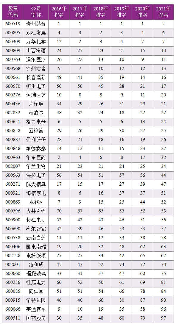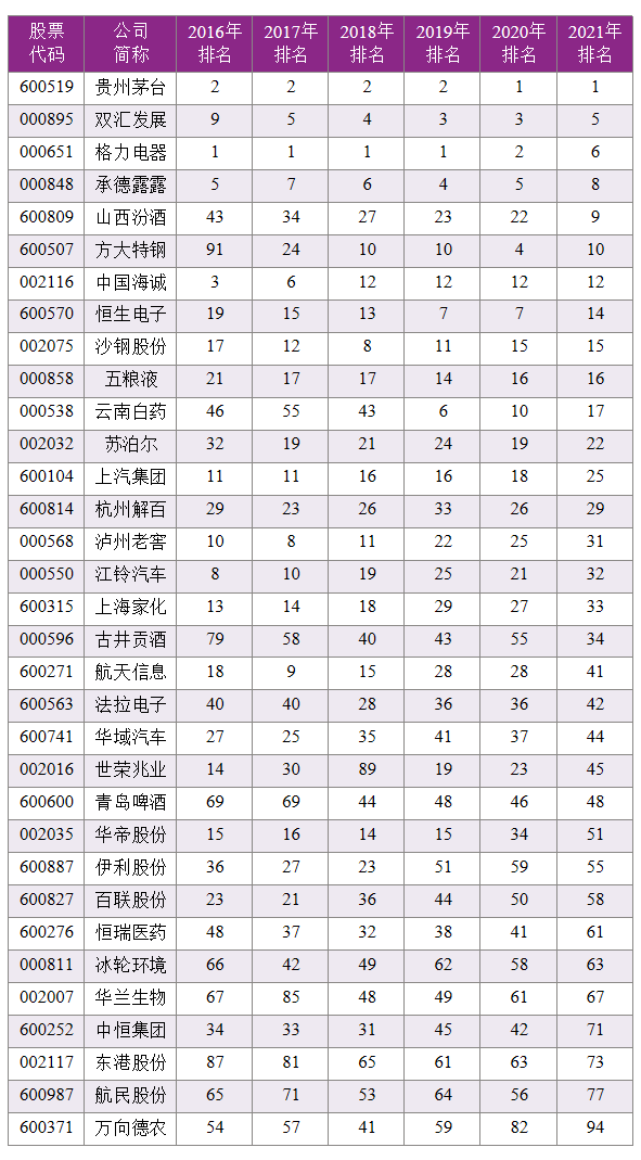 表5 2016-2021年间连续进入CVA Top50榜单的公司(共19家)