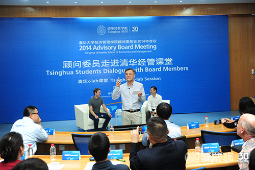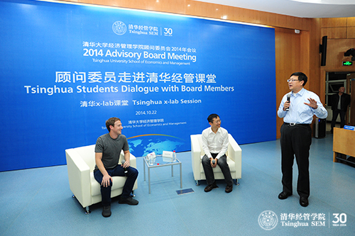 On the evening of October 22, the new member of the Advisory Board of Tsinghua University School of Economics and Management, Mark Zuckerberg, Founder and CEO of Facebook, was invited to have a dialogue with Tsinghua x-lab’s students. During the session, Zuckerberg spoke entirely in Chinese, which thrilled the audience. He remarked that this is his first time public speech in Chinese, which made the session more special and unforgettable for the students present. Professor QIAN Yingyi, Dean of Tsinghua SEM, hosted the dialogue session and Professor CHEN Jining, President of Tsinghua University, concluded the session with remarks. “Tsinghua Students Dialogue with Board Members” is one of the series of activities prior to the Tsinghua SEM Advisory Board meeting; the aim is to create an intimate environment for students to have an up-close and in-depth interaction with board members.
