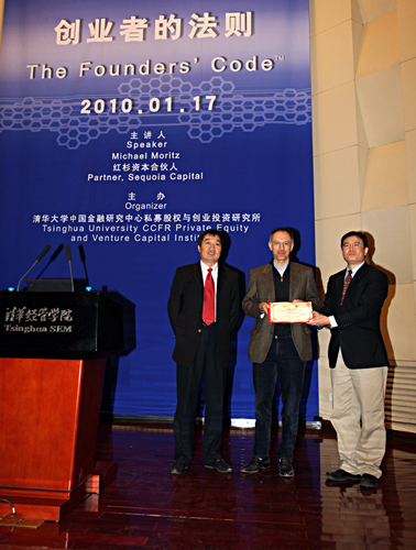 The event was organized by the PE&VC institute, and moderated by Professor LI Jinliang. CAO Wenlian, Deputy Director of the Department of Fiscal and Financial Affairs of NationalDevelopmentand Reform Commission, presented a welcome note. He and Professor LIAO Li, Associate Dean of Tsinghua SEM, together conferred the appointment letter to Michael Moritz.