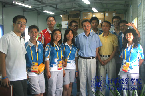 91 Olympic volunteers from Tsinghua SEM are offering their sincere services at various positions as Beijing is hosting the world with pride. On August 13, Dean Qian Yingyi and Associate Dean Zhu Yan visited SEM volunteers working at the National Aquatics Center (the Water Cube), International Broadcasting Corporation, Beijing Organizing Committee for the Games of the XXIX Olympiad (BOCOG) and the Olympic Media Village.