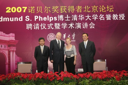2006 Nobel Laureate in Economics Edmund S. Phelps was conferred the title of honorary professorship fromTsinghuaUniversityonSeptember 12, 2007. The conferring ceremony was held at the lecture hall of theMainBuildingof the University, hosted by Professor Bai Chong-en, Chair of the Department of Economics ofSchoolofEconomicsand Management. Witnessed by nearly 500 Tsinghua faculty members and students, Professor Xie Weihe, Vice President of Tsinghua University conferred the title of honorary professorship to the distinguished economist.