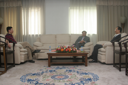 (Professor Qian Yingyi, Dean of Tsinghua SEM (middle) and Professor Liao Li, Associate Dean of Tsinghua SEM (left) held talks with Mr.Antony Leung before the speech)