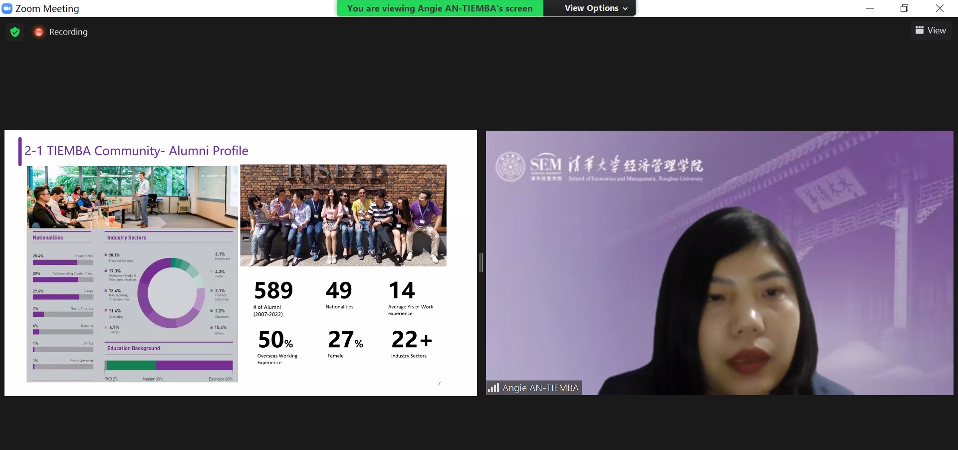 After the lecture, AN, director of the TIEMBA program, gave a detailed presentation about its unique partnership between Tsinghua SEM and INSEAD, one of the most prestigious EMBA programs in the world. She said the recruitment for TIEMBA 2023 is underway.