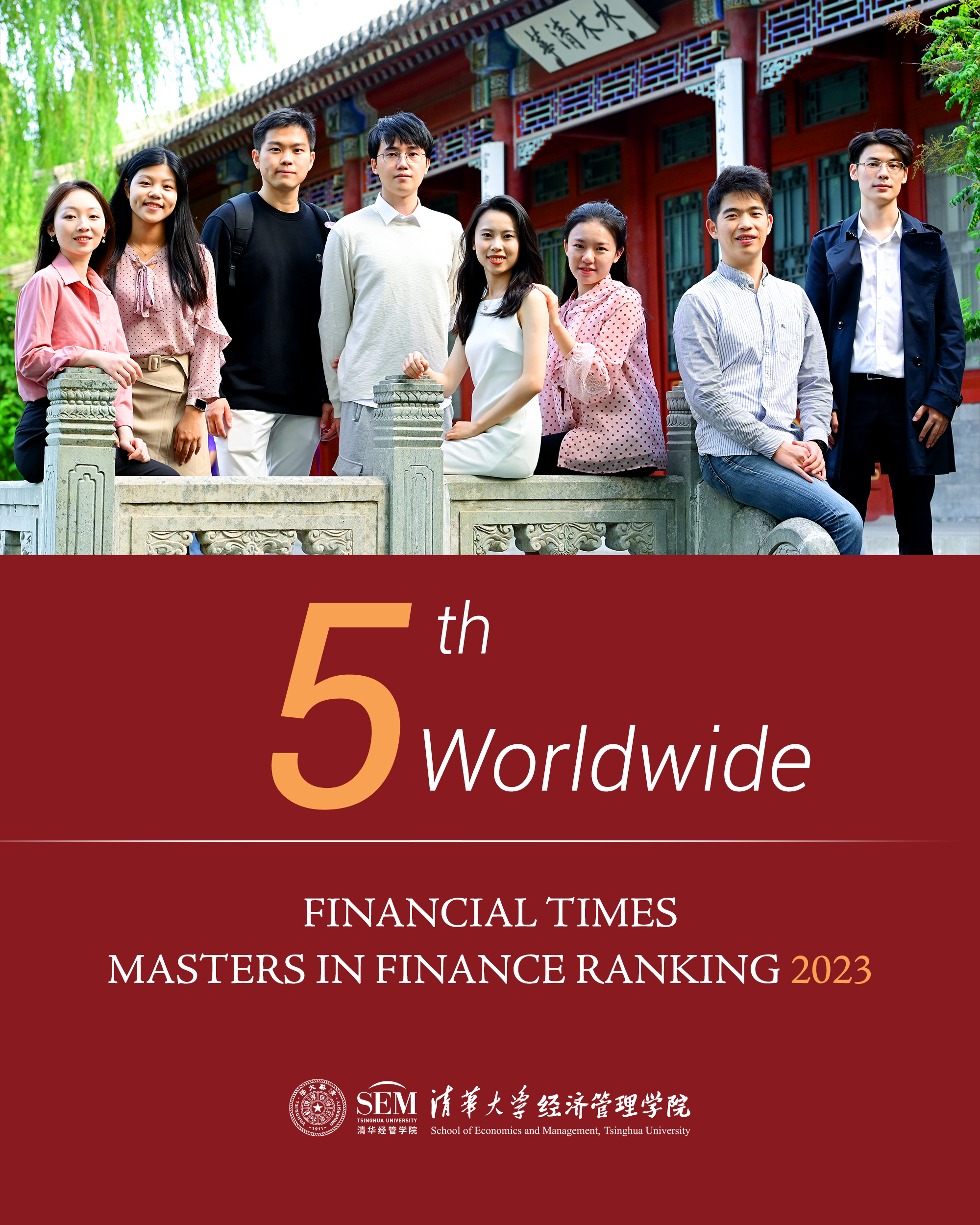 The Financial Times published its 2023 ranking of Masters in Finance Pre-Experience programs on June 12, 2023. The Master of Finance at Tsinghua University School of Economics and Management (Tsinghua SEM) ranked 5th worldwide and 1st in Asia. Tsinghua University is the first school from the Asia-Pacific region to appear among the Top 5 since the Financial Times first published its world ranking of Masters in Finance Pre-Experience programs in 2011.