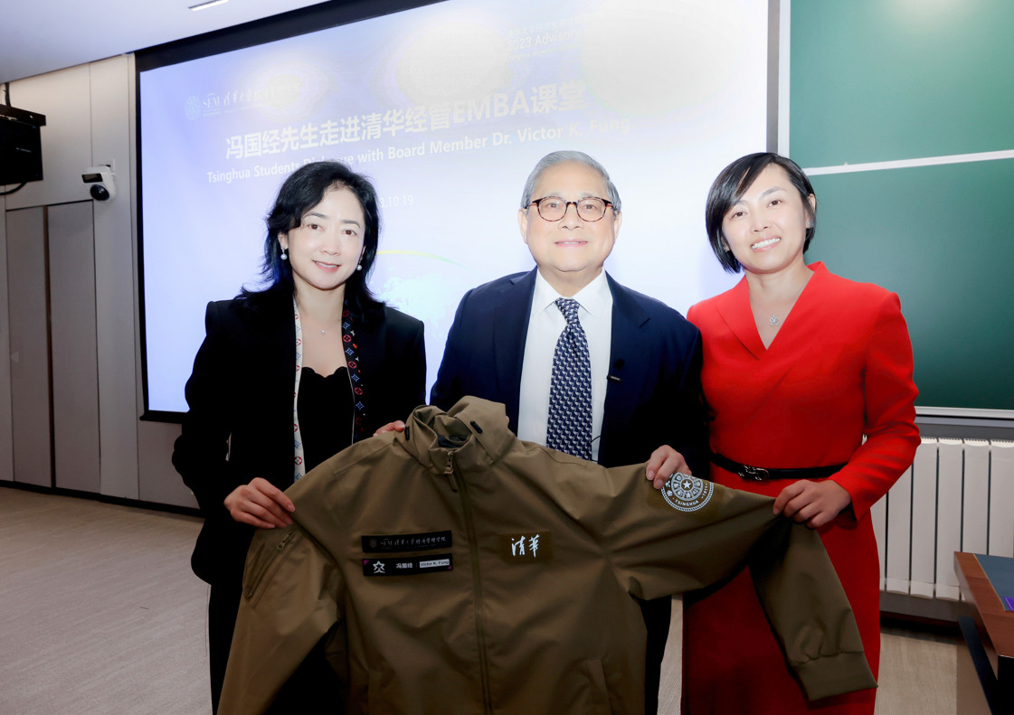"Entrepreneurs in this new era must understand global trend and optimize a strategy that is beneficial for all. Professor Fung's leadership, pioneering management mindset, and determination in advancing innovation are worth learning for every entrepreneur," XUE Jian said. To show the school's appreciation for Professor Fung, XUE Jian and JIA Li, director of Tsinghua EMBA Education Center, presented Fung with a special coat printed with his name. It was the same type of coat worn as a uniform by EMBA students' retracing walks through Southwest Associated University in Yunnan Province earlier this year. XUE said the "Knowing China by Walking" curriculum was unique to Tsinghua SEM's EMBA program: participating students could visit the century-old Li & Fung Group and learn how to manage a successful corporation in the future.