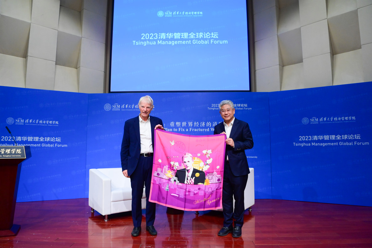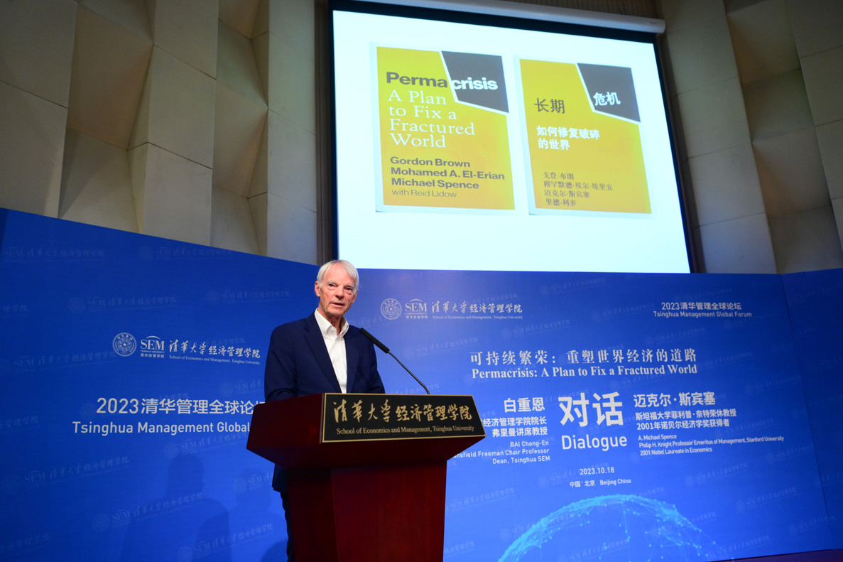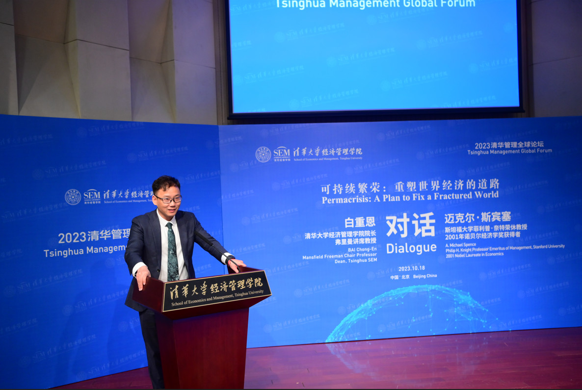 The Tsinghua Management Global Forum, an event attached to the Tsinghua University School of Economics and Management (Tsinghua SEM) 2023 Advisory Board Meeting, took place on October 18 at Tsinghua SEM. Distinguished speakers, including A. Michael Spence, Philip H. Knight, professor emeritus of management at Stanford University, 2001 Nobel Laureate in Economics, and a member of the Tsinghua SEM Advisory Board, and BAI Chong-En, Mansfield Freeman chair professor and the dean of Tsinghua SEM, met to discuss the theme "Permacrisis: A Plan to Fix a Fractured World."