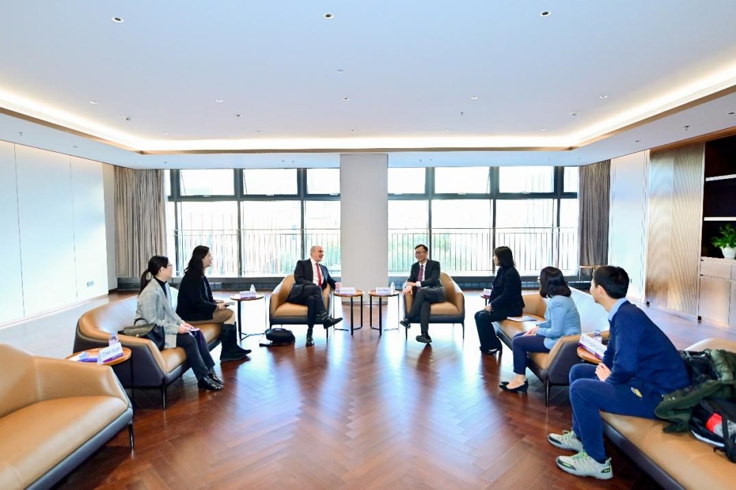 Before the speech, Barnett had a meeting and talked with HE Ping, CHI Wei, HUANG Cheng, and GU Yingjie.