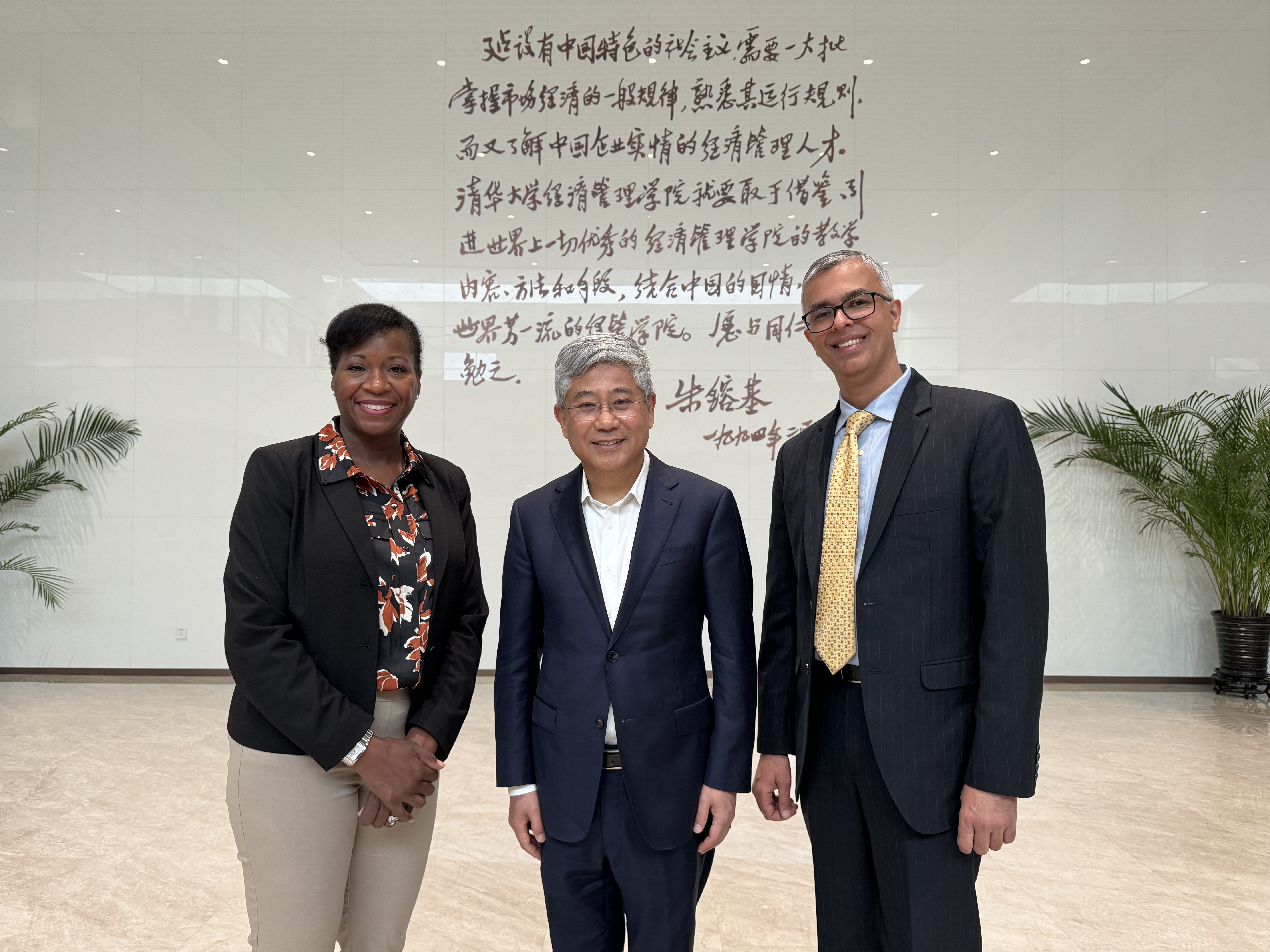 Joy Jones, CEO of the Graduate Management Admission Council (GMAC), and Ashish Bhardwaj, senior vice president and head of Market Development, visited the School of Economics and Management at Tsinghua University (Tsinghua SEM) for a symposium and discussion with Dean BAI Chong-En on January 25, 2024. Their visit strengthened bilateral cooperation in management education and promoted innovation and development.