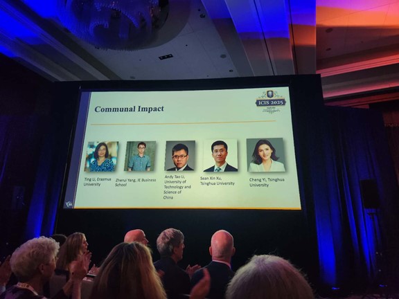 A team led by Professor Xu Xin and Associate Professor Yi Cheng from the Department of Management Science and Engineering at Tsinghua University School of Economics and Management (Tsinghua SEM) was awarded the 2025 AIS Impact Award by the Association for Information Systems (AIS) on December 15, 2025, at the International Conference on Information Systems (ICIS) held in Nashville, the United States.