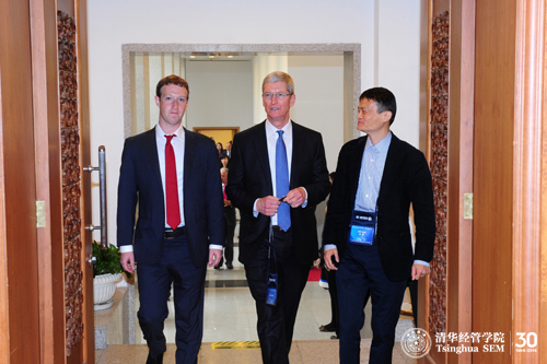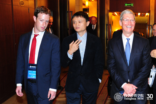 On October 24, 2014, the 2014 Advisory Board Meeting of Tsinghua University School of Economics and Management (Tsinghua SEM) was held, with 38 board members participating in the meeting and related activities. Out of the members present, the three most visible members are Tim Cook, CEO of Apple Inc., Jack Ma, Executive Chairman of Alibaba Group, and Mark Zuckerberg, Founder and CEO of Facebook.