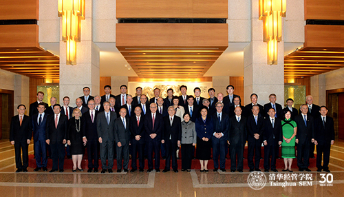 Prior to the meeting, WANG Qishan, member of the Standing Committee of the Political Bureau of the CPC Central Committee and Secretary of the Central Commission for Discipline Inspection (CCDI) of the CPC, met with the overseas members of the Board. WANG Qishan, ZHU Rongji, LIU Yandong and others also had a group photograph taken with the Board members attending the 2014 Advisory Board Meeting of Tsinghua SEM.