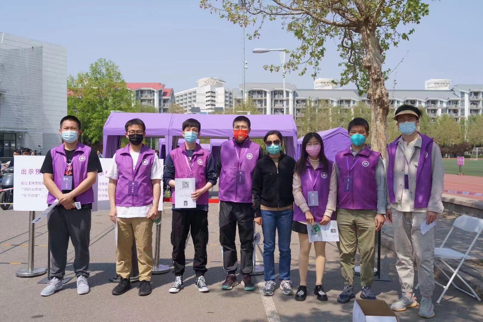 下午1点钟,听涛园西广场和C楼东侧核酸检测点的医生完成到岗,经博20的志愿者整装完毕,他们用饱满的状态开启核酸检测服务工作。有的站在入口处,举着标示提醒同学们扫码预约;有的站在过道旁,提醒检测的同学戴好口罩,做好个人防护;有的穿着防护服,为检测的同学扫码登记。现场保障工作有条不紊,秩序井然。