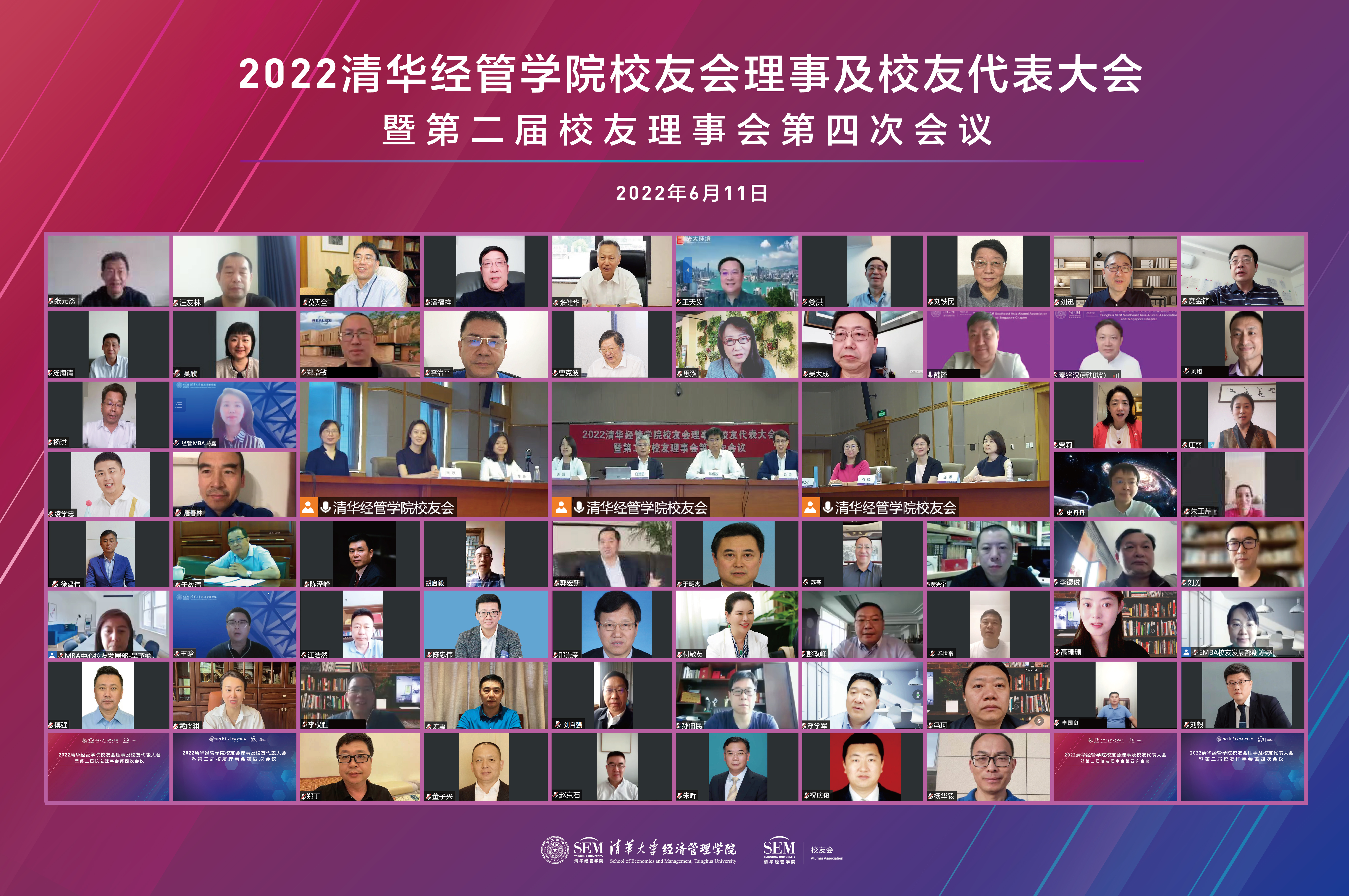 2022年6月11日,清华经管学院校友会理事及校友代表大会暨第二届理事会第四次会议举行。学院老师、校友会理事、各区域校友会以及教学项目区域校友会代表共计60余位云端共聚。学院院长、校友会会长白重恩,学院党委书记、校友会副会长陈煜波,院长助理迟巍出席会议。