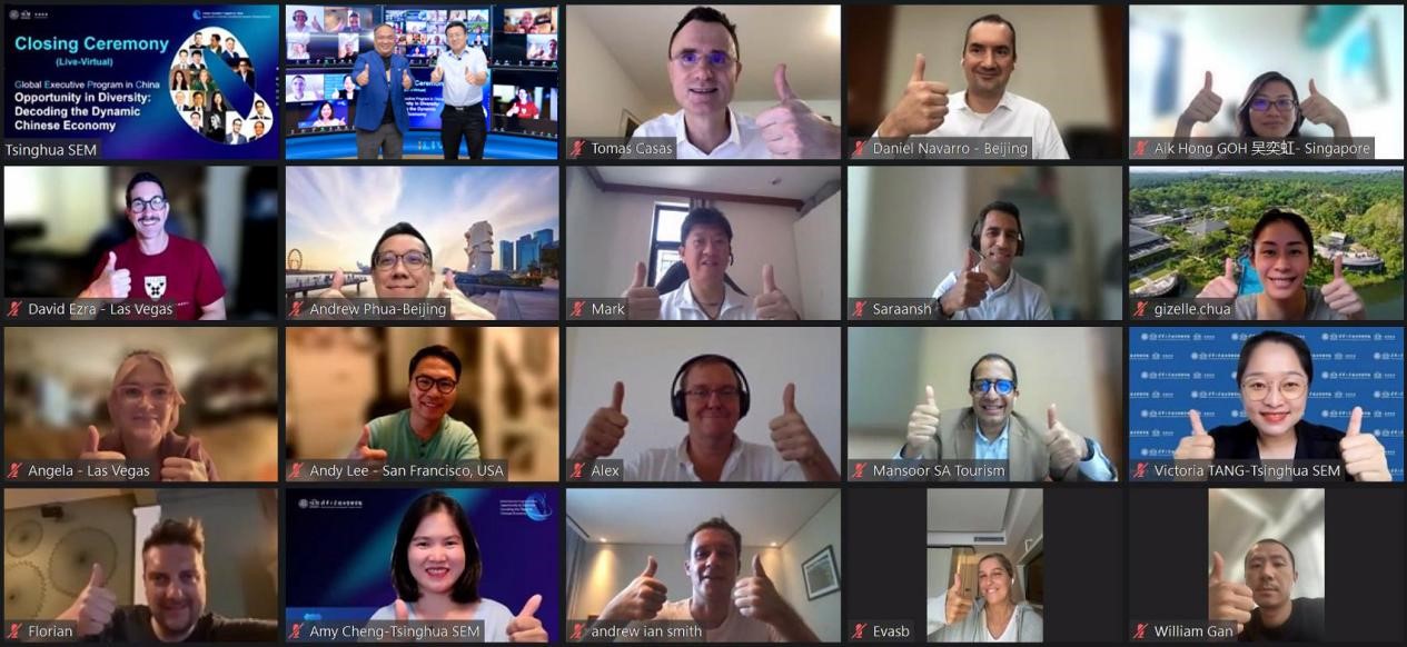 清华经管学院高管教育中心全球课程主任狄瑞鹏主持结业仪式。在为期5个多月的线上学习中,学员们跨越时区,通过讲座、案例讨论、论坛、互动学习等形式,与来自世界各地的学者、企业家和高管互融互通,深入系统了解中国经济的政策、实践与发展机遇。一段记录着学员们求知探索、导师指点迷津、师生教学相长的视频将一幕幕呈现在眼前,唤起了大家美好的回忆。