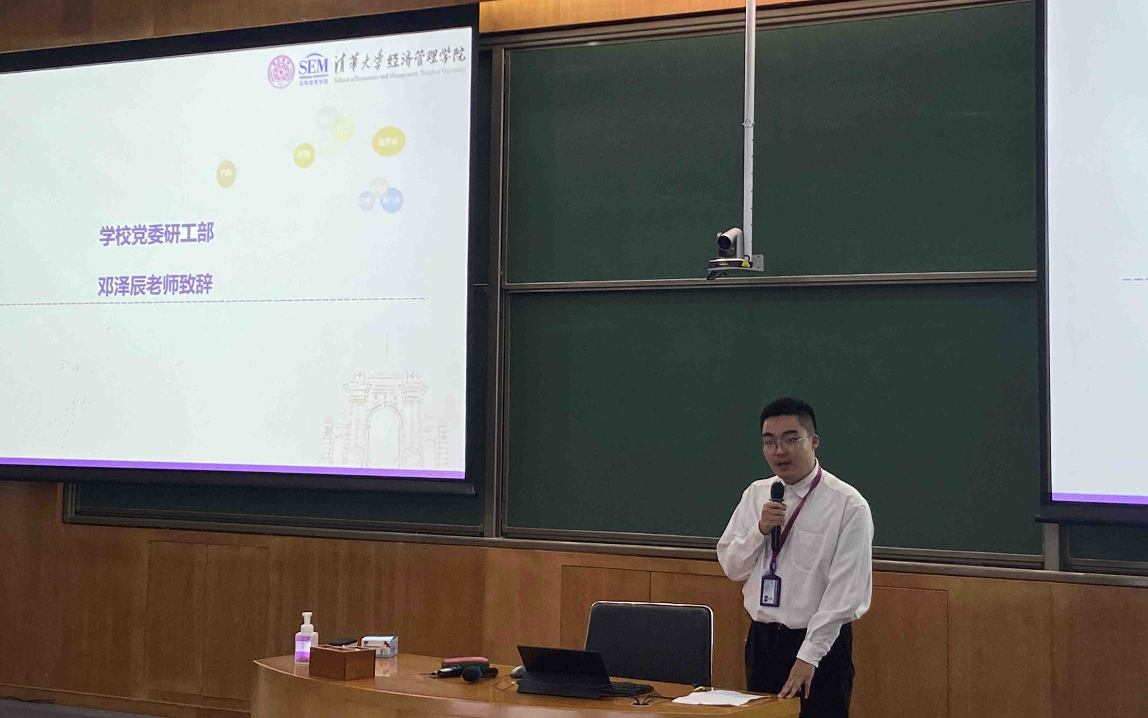 邓泽辰代表学校党委研工部致辞。他首先对克服困难、出色完成实践的同学们表示肯定。他说,受到疫情等因素的影响,学校制定了可选的实践学分替代方案,也仍有较多数量的同学克服困难,采用形式多样的方式高质量完成必修实践环节。经管学院的同学们在行前准备中能够主动对接项目负责人需求,实践期间能够积极投身基层一线,在实践中检验自身学术的专业能力,锻炼组织协调能力,提升人际交往能力,展现出清华学子良好的精神风貌与专业素养。同学们产出丰硕的实践成果,涌现出一批踏实肯干、乐于奉献的代表,在服务校地合作、设计产业发展规划、协助政策制定等多层面做出贡献,同学们的表现得到所在实践基地和实践单位干部群众的一致好评。