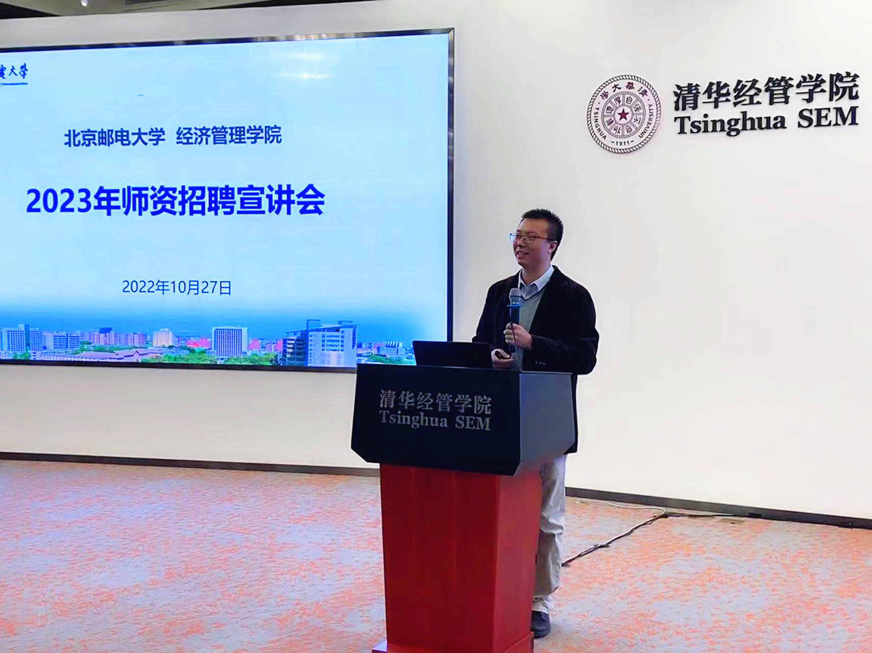2022年10月27日,北京邮电大学经济管理学院(以下简称北邮经管学院)2023年师资招聘宣讲会在清华经管学院举行。本次招聘宣讲会由北邮经管学院院长何伟、北京邮电大学人事处处长闫强带队,北邮经管学院副院长赵晨、办公室主任李靖璇、管理科学与工程系系主任万岩、工商管理系系主任王砚羽、应用经济系系主任李宏兵和公共管理系系主任许冠南一同参加。清华经管学院副院长何平、院长助理迟巍、党委研究生工作组组长刘庆、管理科学与工程系党支部书记郭迅华、职业发展中心主任顾英杰和清华经管学院来自不同专业的50余名博士生参与本次宣讲会。