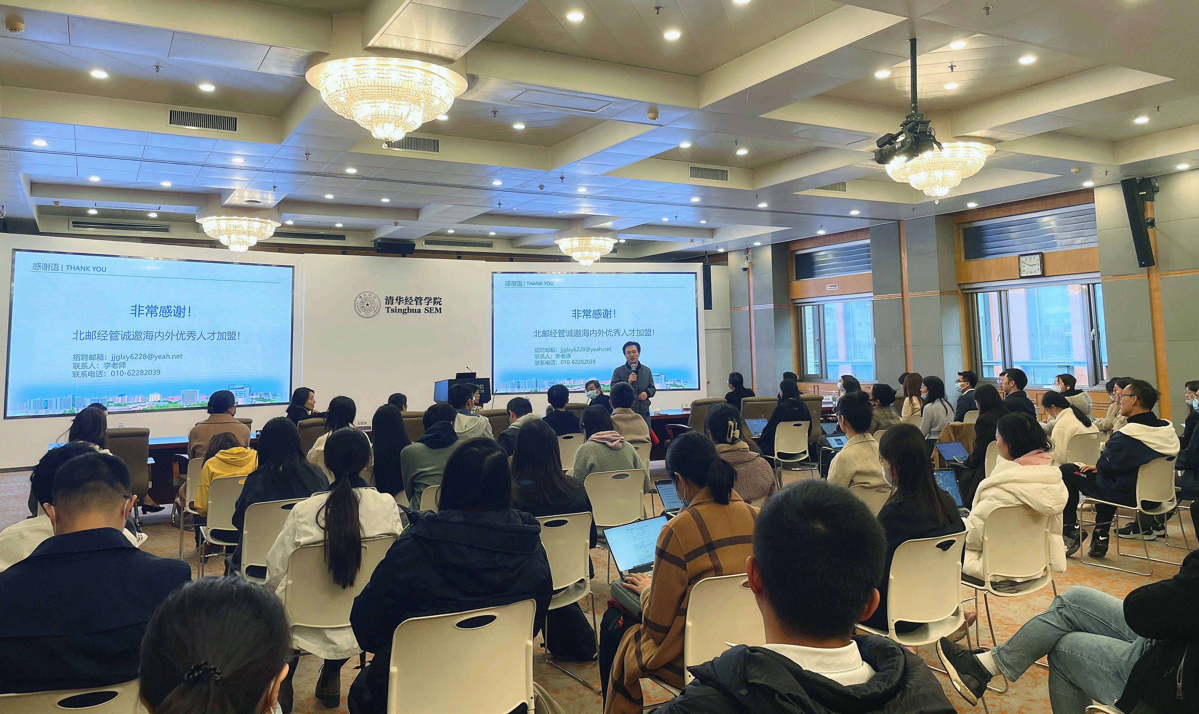 何伟介绍了北邮经管学院的学科建设和学科发展水平,并从历史沿革、地理位置及各类资源的角度,阐明了北邮经管学院的优势。何伟表示,北邮经管学院高度重视优秀人才的引进,真诚欢迎清华经管学院的同学能够坚定理想抱负、怀揣高远目标、秉持学术初心,加入北邮经管学院,助力北邮经管学科发展。闫强补充介绍了学校、学院的人才支持条件,以及相关政策和未来规划,表示北邮经管学院一定会为优秀人才提供广阔的发展空间。