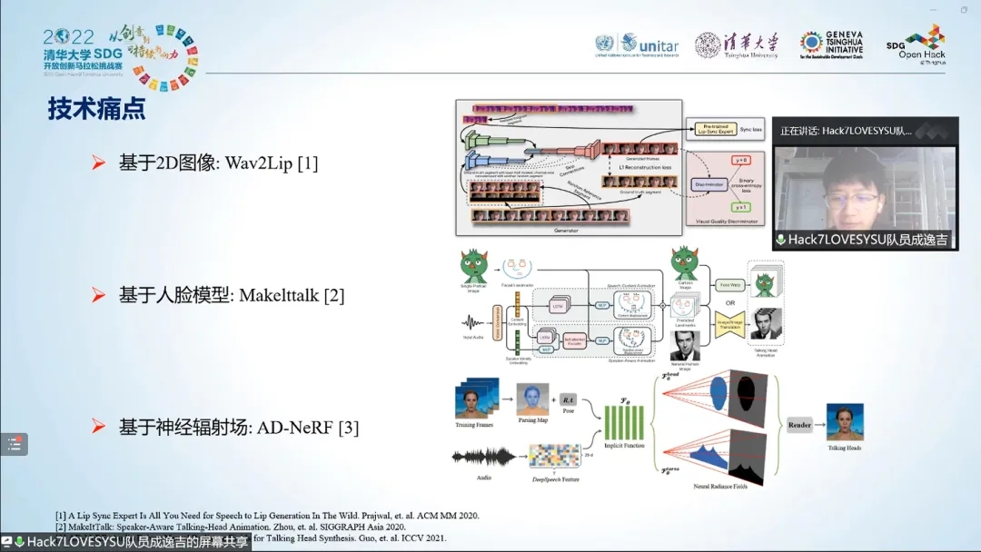 Hack7 Love SYSU团队介绍,目前数字人相关行业所遇到的痛点包括速度慢、效果差、成本高,这些痛点大大阻碍了数字人的落地。因此,行业内最大的目标就是构建低成本泛用人体数字化技术及高保真可信数字人重现技术,呈现沉浸式人机交互体验,促进各项产业数字化转型,实现可持续发展。团队所提出的语音驱动的人脸表情生成方案,作为数字人技术中的重要一环,能很大程度解决这些问题。