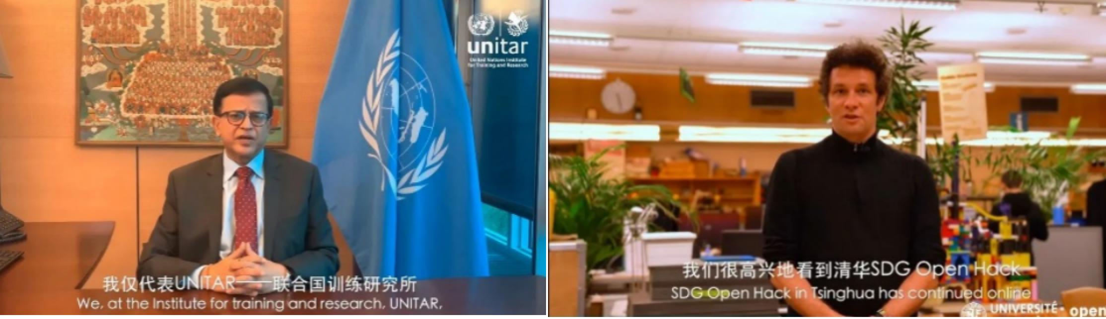 联合国训练研究所执行主任、联合国助理秘书长、日内瓦-清华GTI倡议顾问委员会主席Nikhil Seth和日内瓦大学经管学院高级讲师、Open Geneva开放创新马拉松发起人Thomas Maillart发来视频,祝贺SDG开放创新马拉松挑战赛举行,表示非常高兴清华SDG Open Hack并未受疫情的影响而停下脚步。