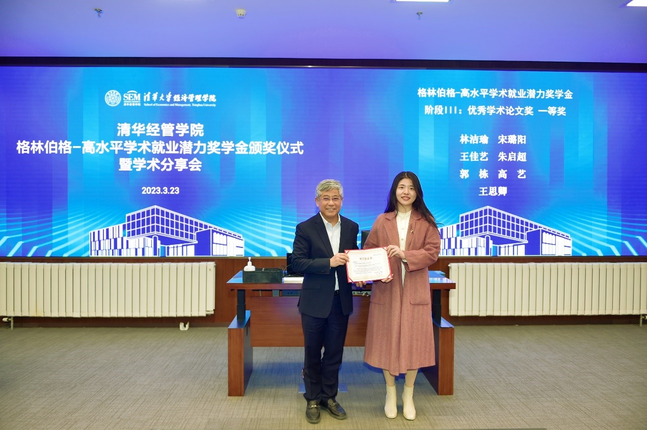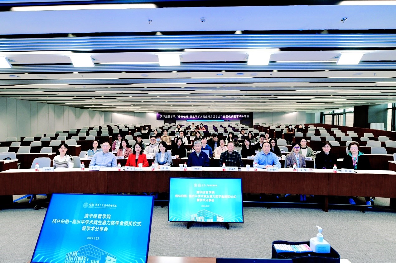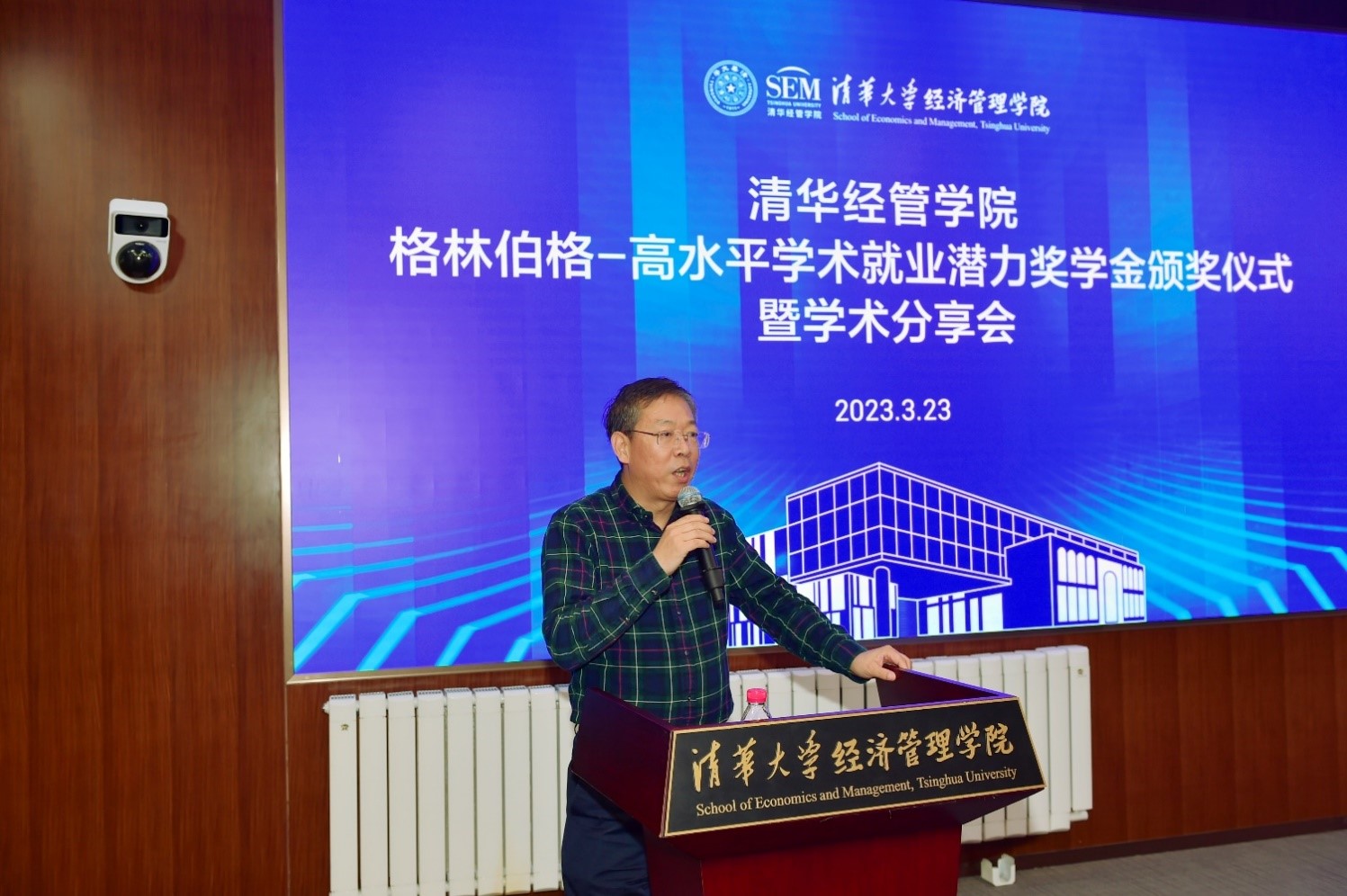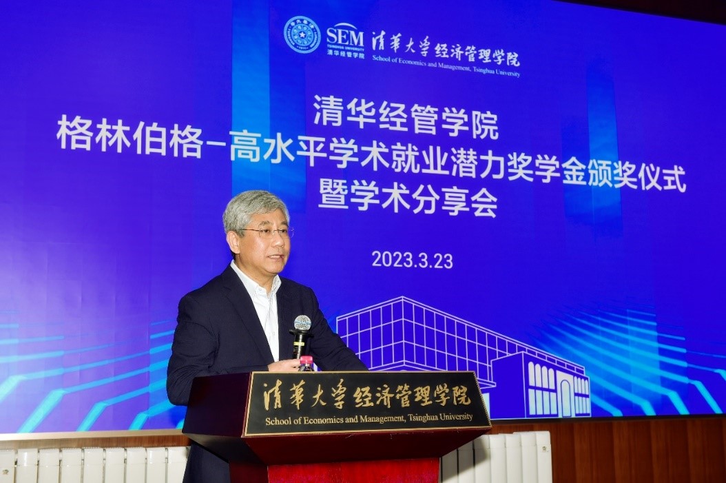 2023年3月23日,清华经管学院首届“格林伯格-高水平学术就业潜力奖学金”颁奖仪式暨学术分享会举行。学院院长白重恩、院长助理迟巍、教学办公室学术主任朱玉杰、博士项目会计系协调人罗婷、创新创业与战略系协调人李习保、领导力与组织管理系协调人卢舒野以及学院七个系的博士生代表出席本次活动。活动由朱玉杰主持。