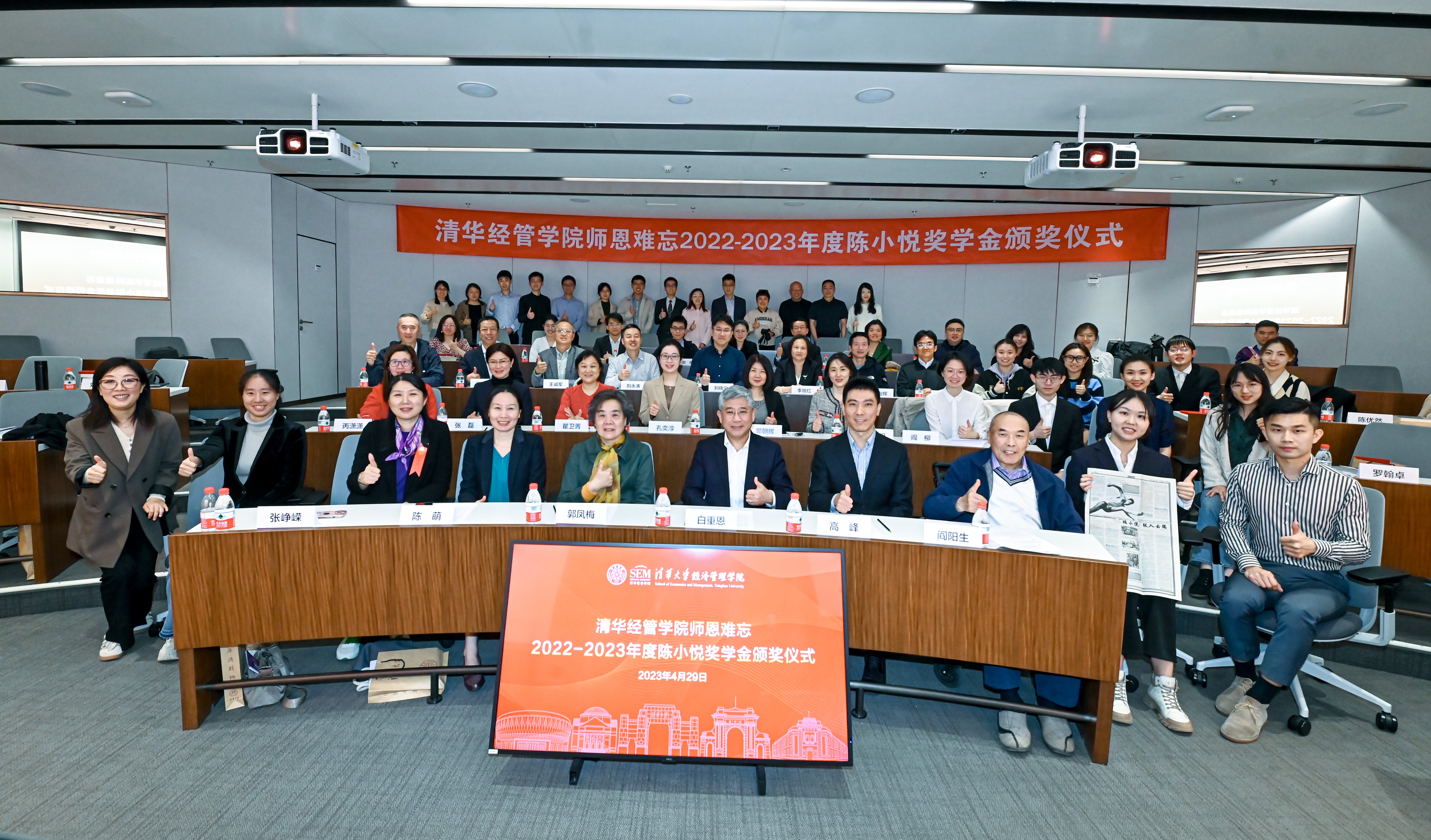 2023年4月29日,2022-2023年度“清华经管学院陈小悦奖学金”颁奖仪式举行。陈小悦教授的夫人郭凤梅女士,女儿陈萌女士,陈小悦教授的好友阎阳生,清华经管学院院长、弗里曼讲席教授白重恩,陈小悦教授的学生,以及学院相关部门负责人出席活动。活动由学院党委副书记高峰主持。