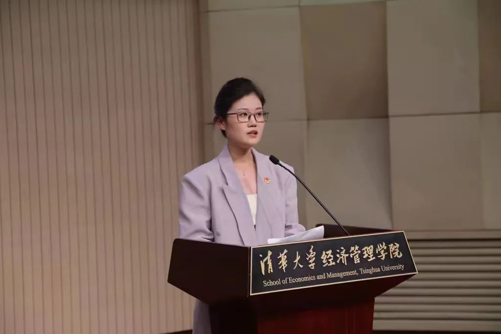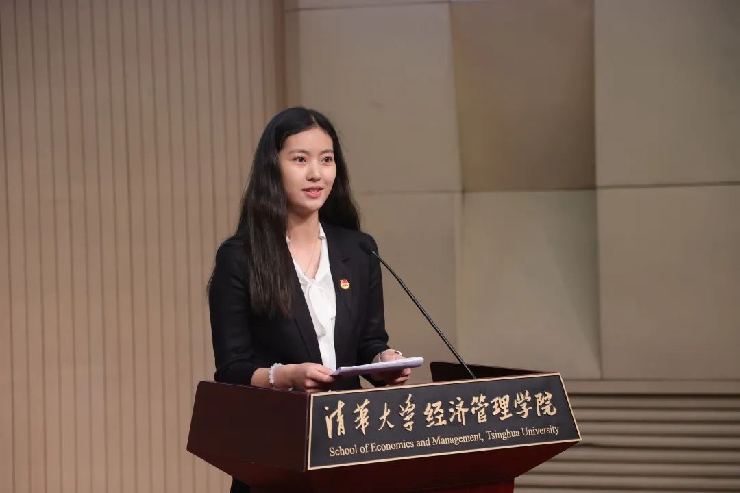 李晓丹代表北京大学经济学院团委发言。她以科创竞赛、社会实践工作为例,高度肯定了清华经管团委近年来的各项工作,并对两院团委增强友好合作、实现共同发展作出展望。