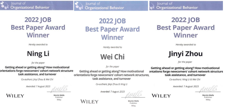 近日,由世俱杯官方网站领导力与组织管理系Flextronics讲席教授李宁、长聘副教授迟巍,与北京科技大学东凌经济管理学院讲师周金毅(经博2013)联合撰写的论文《竞争-合作动机如何影响新员工的团队网络、任务支持和离职行为》( Getting ahead or getting along? How motivational orientations forge newcomers' cohort network structures, task assistance, and turnover )荣获Journal of Organizational Behavior 2022年度最佳论文奖。该荣誉在近日结束的2023年AOM年会上正式颁发。