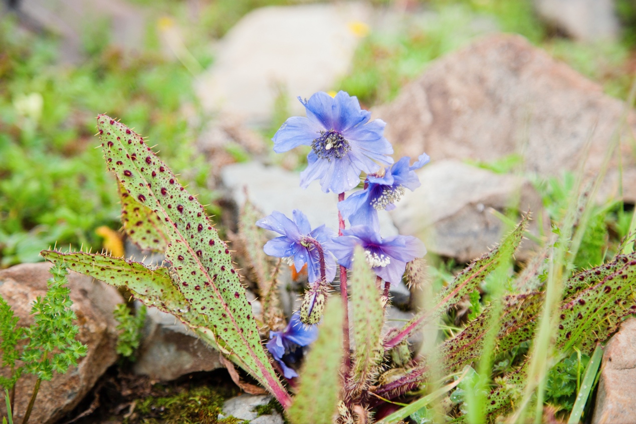 在流石滩上,香格里拉高山植物园方晔和李聪,以及同行的黄双全教授带着同学们辨识和观察野生绿绒蒿植株。绿绒蒿是高原特有珍稀植物,生长于中国横断山-喜马拉雅山海拔3000-4000米以上的流石滩或冰川前沿,因此又被叫做“离天空最近的花朵”。