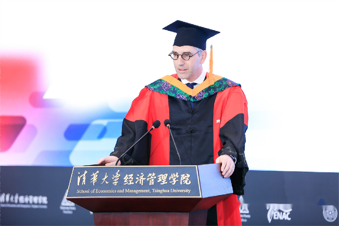 尼古拉•卡扎利斯代表法国国立民航大学致辞,他对毕业生表达热烈的祝贺,希望大家能够学以致用,将在EMBA项目中学习到的知识融合进未来发展的决策中。同时,他期待在未来的职业发展中,两校校友能够互帮互助,共同成长。