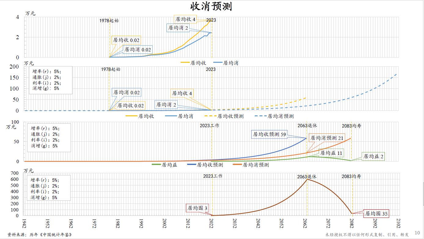 根据从统计年鉴数据进行预测,我们发现使得养老储蓄余额Ra在平均寿命时仍有结余的最高的消费增长率是5%(图6)。从经济基础的能力来讲,我们有能力通过自己创造财富和自主消费来解决养老问题。这个问题我们需要一个系统性的制度安排。虽然现在老龄化问题很严重,但是好在我们自己养自己其实是有可能的。