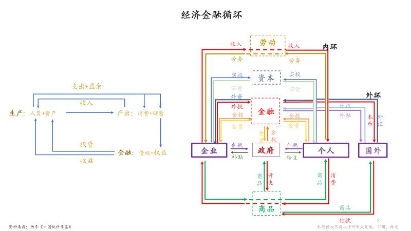 我们先讨论一下金融的作用。经济的核心是生产,生产的主要驱动力是人员和资产、技术等要素。我们借助经济金融循环来讨论(图1)。首先,生产过程形成产出。产出即为收入,因为产出分配给参与生产的人员,就形成了人员的收入。其次,收入分配为消费和储蓄。什么是储蓄?没有消费的收入就是储蓄。最后,储蓄是核心基础,由它产生的权益资本也好,衍生的债权资本也好,均通过投资实现收益回报,并返还给投资人,支持他们再用于生产等经济活动。如上所述,这构成了一个持续循环的过程。