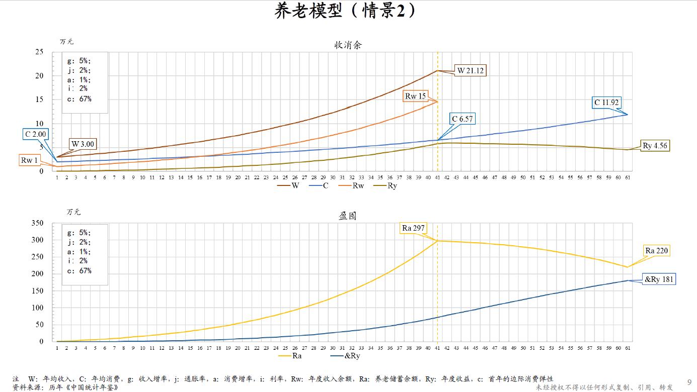 模型的逻辑如下。养老最终是靠每个劳动者创造的财富。从金融的角度来讲,这无非涉及挣钱,储蓄投资,然后用储蓄来养老。从整个社会的角度来讲,这是一个平等的概念,实际上是自己创造财富,养活自己一生。根据这一逻辑,我进行了一个测算,即给定现在的经济条件,我们可不可以做到这一点?首先,让我们看一下模型。收入W(图4上红线)从工作之后开始增长,直到最后的退休,退休之后收入为零。消费C(图4上蓝线)也从开始一直增长,直到最后。Rw(图4上黄线)是薪酬减掉消费后的结余部分,其被投入养老基金,获得投资收益率。模型有四个重要的参数:社会的投资收益率、收入增长率、通胀率和消费增长率。图4假设这三个参数分别为2%,5%、2%和2%。Ra(图4下黄线)是基金的累积值,包括每年的新投入基金的出现,与投资收益,其在退休时达到顶点。我们希望在平均寿命的最后时刻,Ra为0(图4)。如果调整参数,消费增长率由2%(图4)降低为1%(图5),则平均寿命最后时刻,养老储蓄余额Ra还有结余。