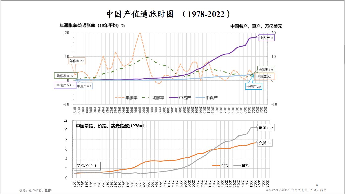 为与世界更好比较,图3是用美元计价的数据,可看出1978年到现在,经济的真实产值增加了10倍(图3下灰线),价格同时也上涨了7倍左右(图3下黄线)。这表明我国经济取得了很大的增长。