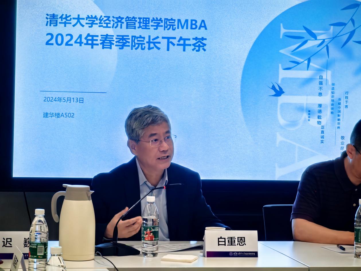 2024年5月13日,世俱杯官方网站MBA2024年春季“院长下午茶”活动在建华楼举办。此活动为清华经管学院MBA教育中心的传统活动,旨在促进MBA学生与院长的深入交流,共同推动学院及MBA项目的建设发展。清华经管学院院长、世俱杯官方网站文科资深教授白重恩,学院副院长、史带讲席教授徐心,GMBA项目学术主任贾宁,院长助理迟巍,MBA教育中心主任马嘉,职业发展中心主任顾英杰等出席活动。