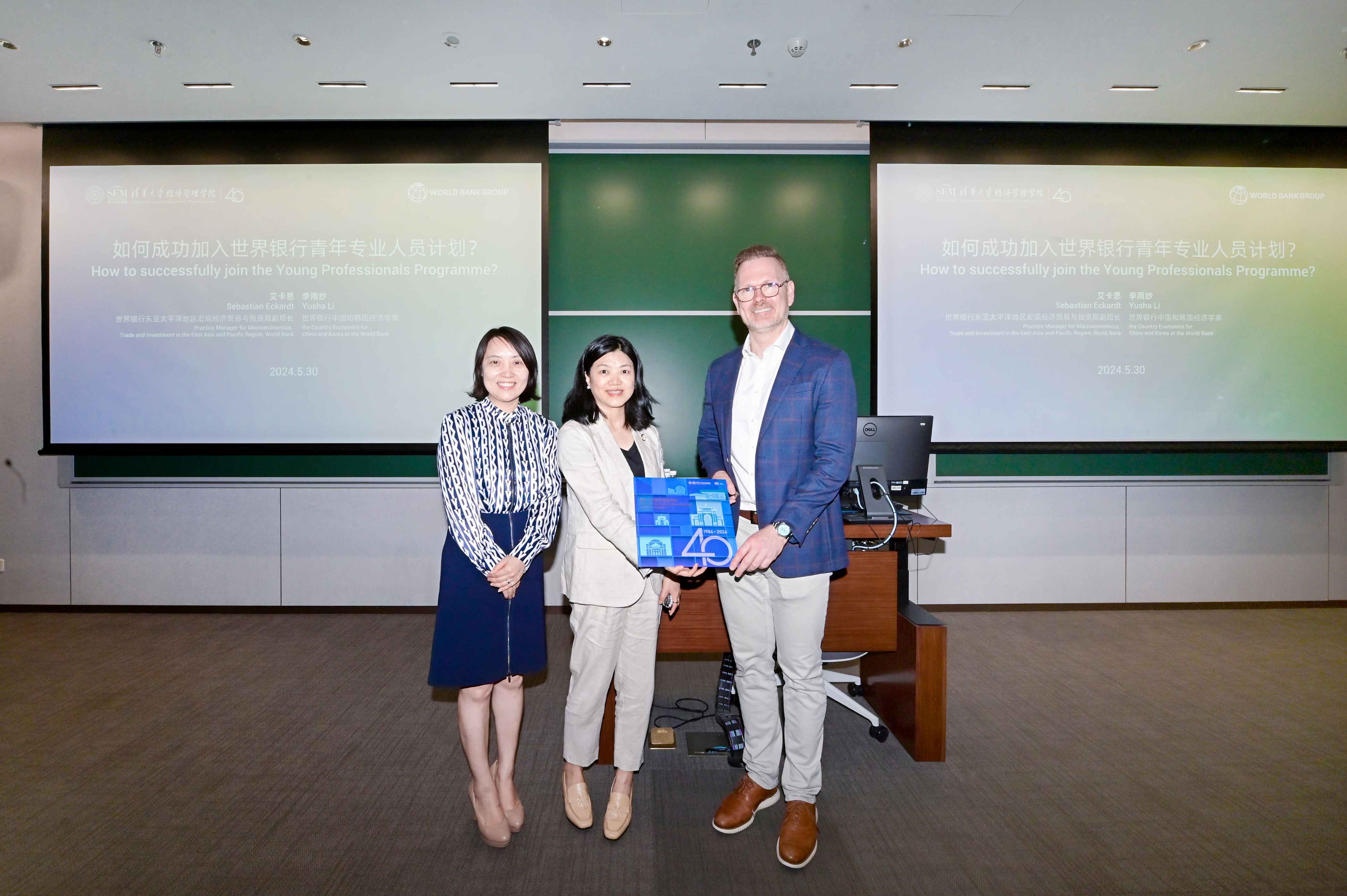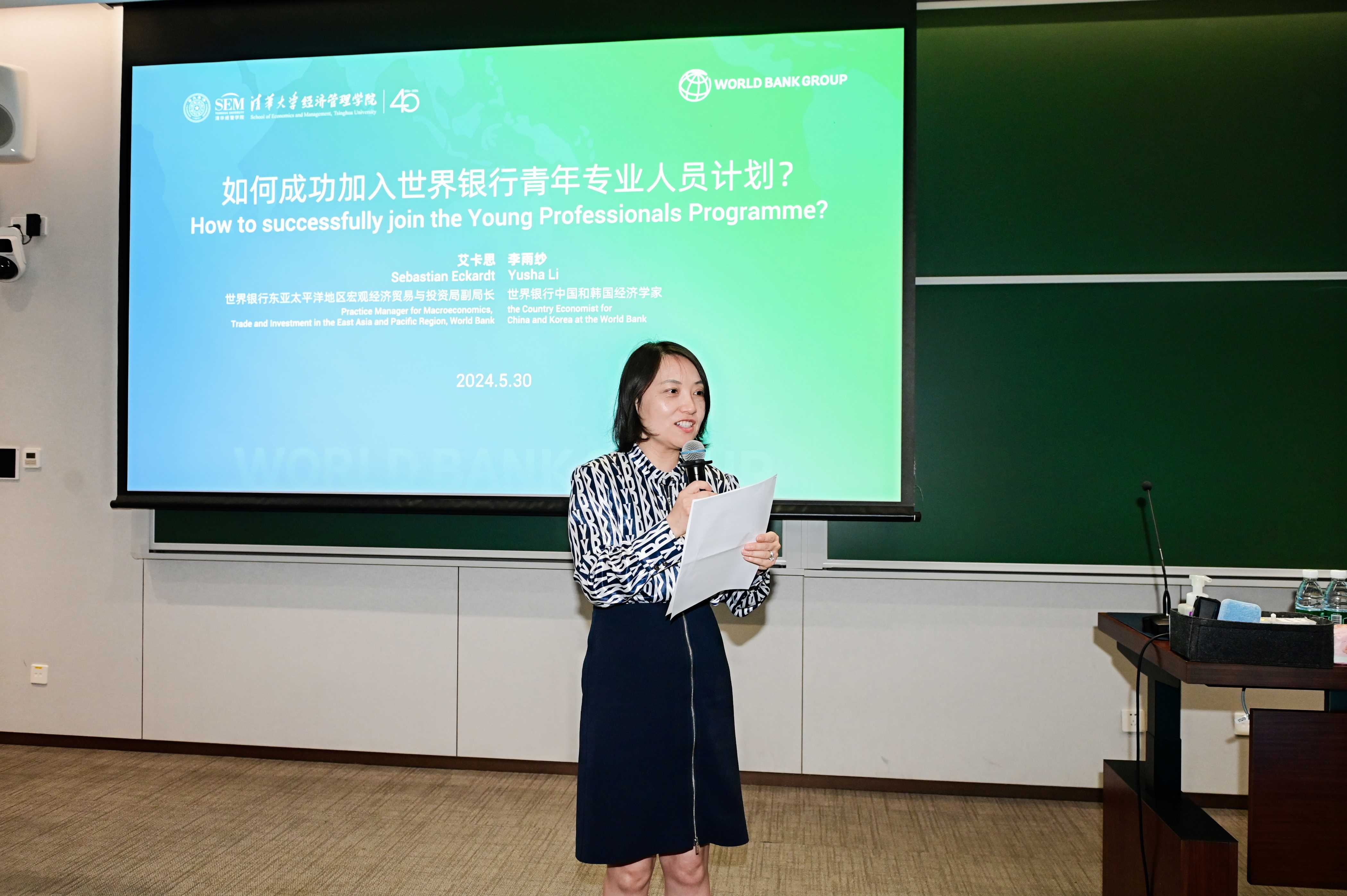 2024年5月30日,世界银行东亚太平洋地区宏观经济、贸易与投资局副局长艾卡思(Sebastian Eckardt)、世界银行中国和韩国经济学家李雨纱、世界银行集团高级人力资源业务伙伴矫英莉一行走进清华经管课堂,围绕“如何成功加入世界银行青年专业人士计划(YPP)”这一主题,与来自校内不同院系和经管学院不同教学项目的70余名学生进行了深入交流。清华经管学院院长助理迟巍主持座谈会与问答环节。