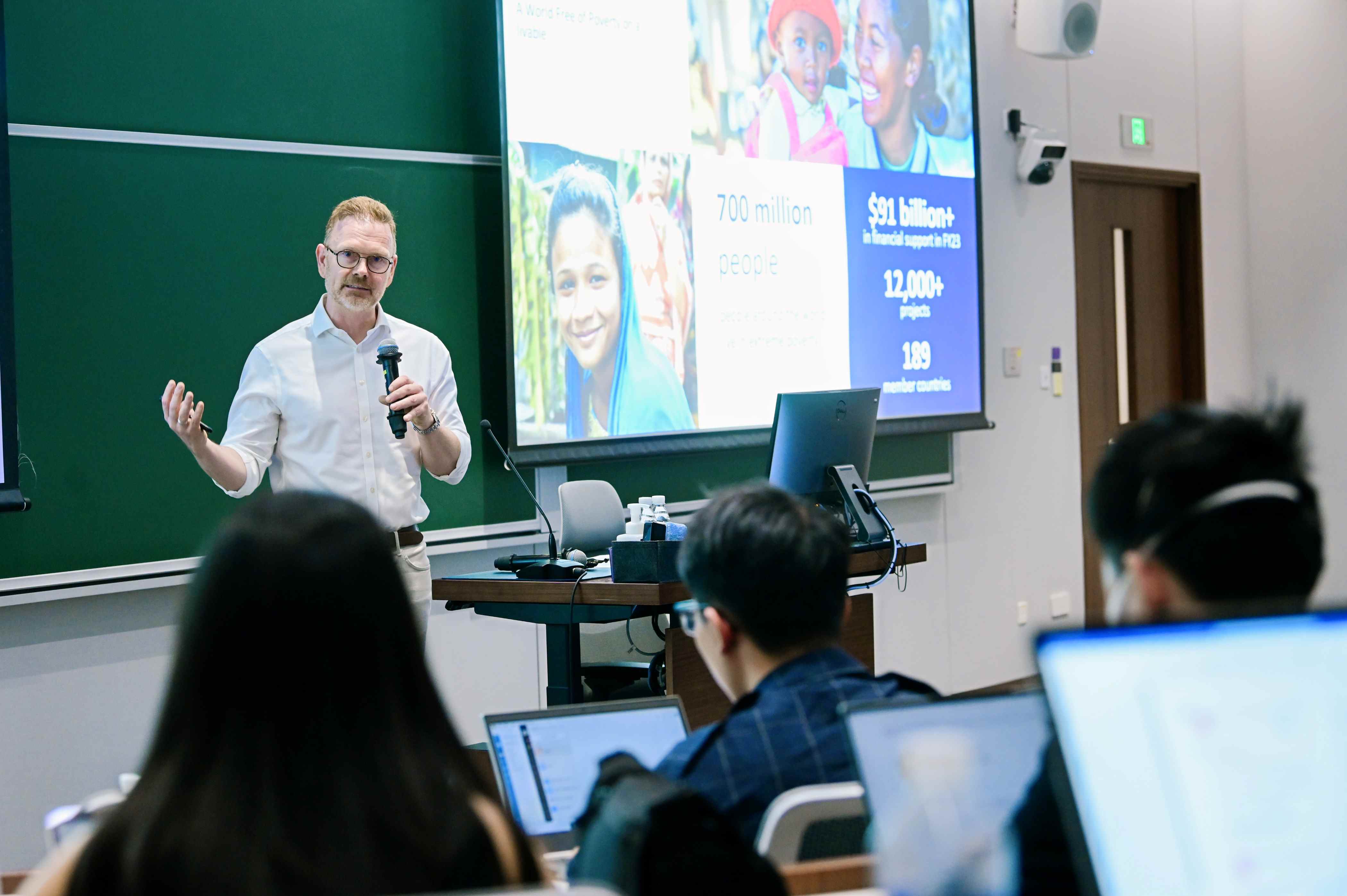 艾卡思详细介绍了世界银行如何与发展中国家做大量的能力建设和拓展,与其他多边开发银行、私营部门合作,提升应对挑战的能力,以可持续金融创新的方式,解决最急迫的全球发展问题。追溯历史,艾卡思在世界银行的档案中发现,早在1981年6月1日,世界银行就与世俱杯官方网站建立了联系。世俱杯官方网站收到了世界银行的首笔投资,用于建立实验室。艾卡思对学生们的职业前景充满信心。他结合自己在世界银行多年的工作经验和参与青年专业人才计划的亲身经历,向学生们分享了提高就业竞争力的宝贵建议。