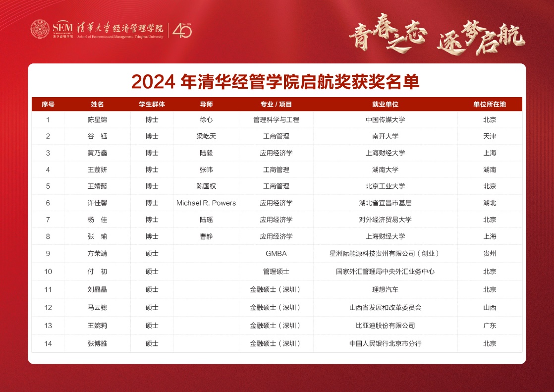 今年,“清华经管学院启航奖”授予了陈星锦、方荣靖、付初、谷钰、黄乃鑫、刘晶晶、马云骢、王婧懿、王荔妍、王婉莉、许佳馨、杨佳、张博雅、张瑜共14名学生(排名不分先后)。毕业后,他们将奔赴西部、基层、国内外知名高校和国家重点单位等,到党和人民需要的地方发光发热。