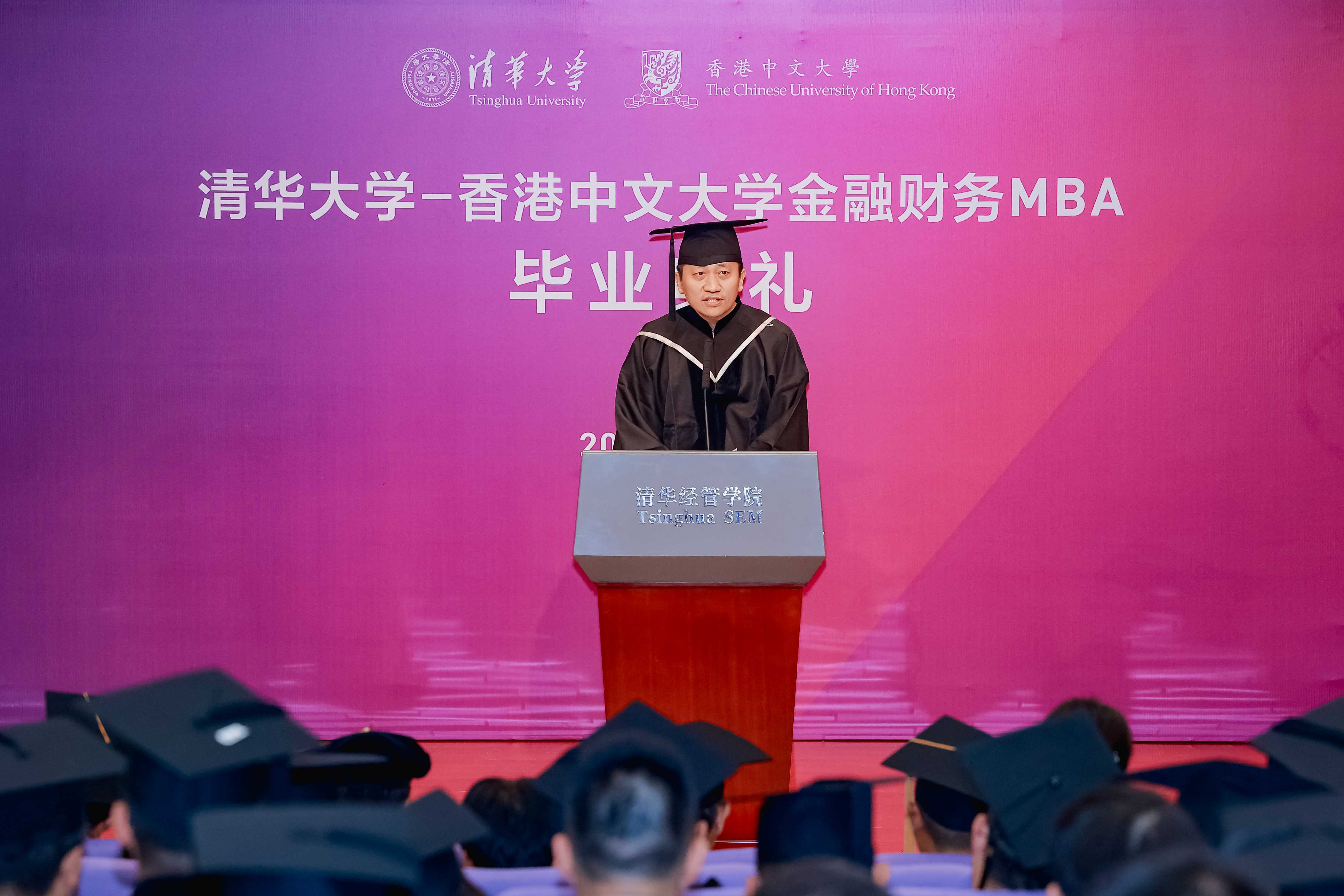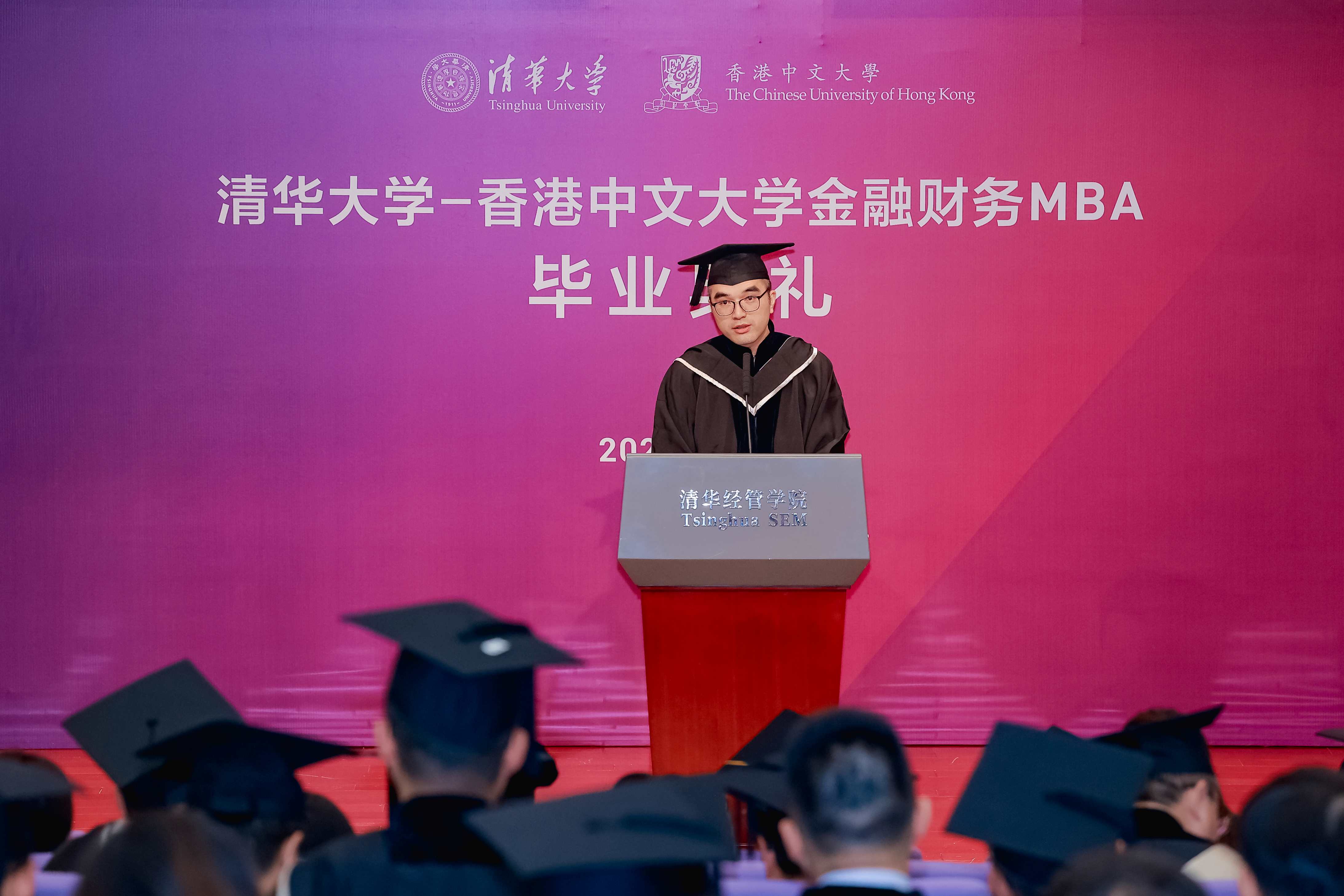 FMBA2022级深圳班学生柳贤回顾了两年多前怀揣梦想踏入校园的时刻,以及在这里见证知识力量、领会探索精神、结识志同道合的朋友的宝贵经历。他表示,选择来清华和港中大,就是拒绝“躺平”。他勉励大家,坚持“器识为先、文艺其从、立德立言、无问西东”的原则,为国家和社会的繁荣贡献力量。