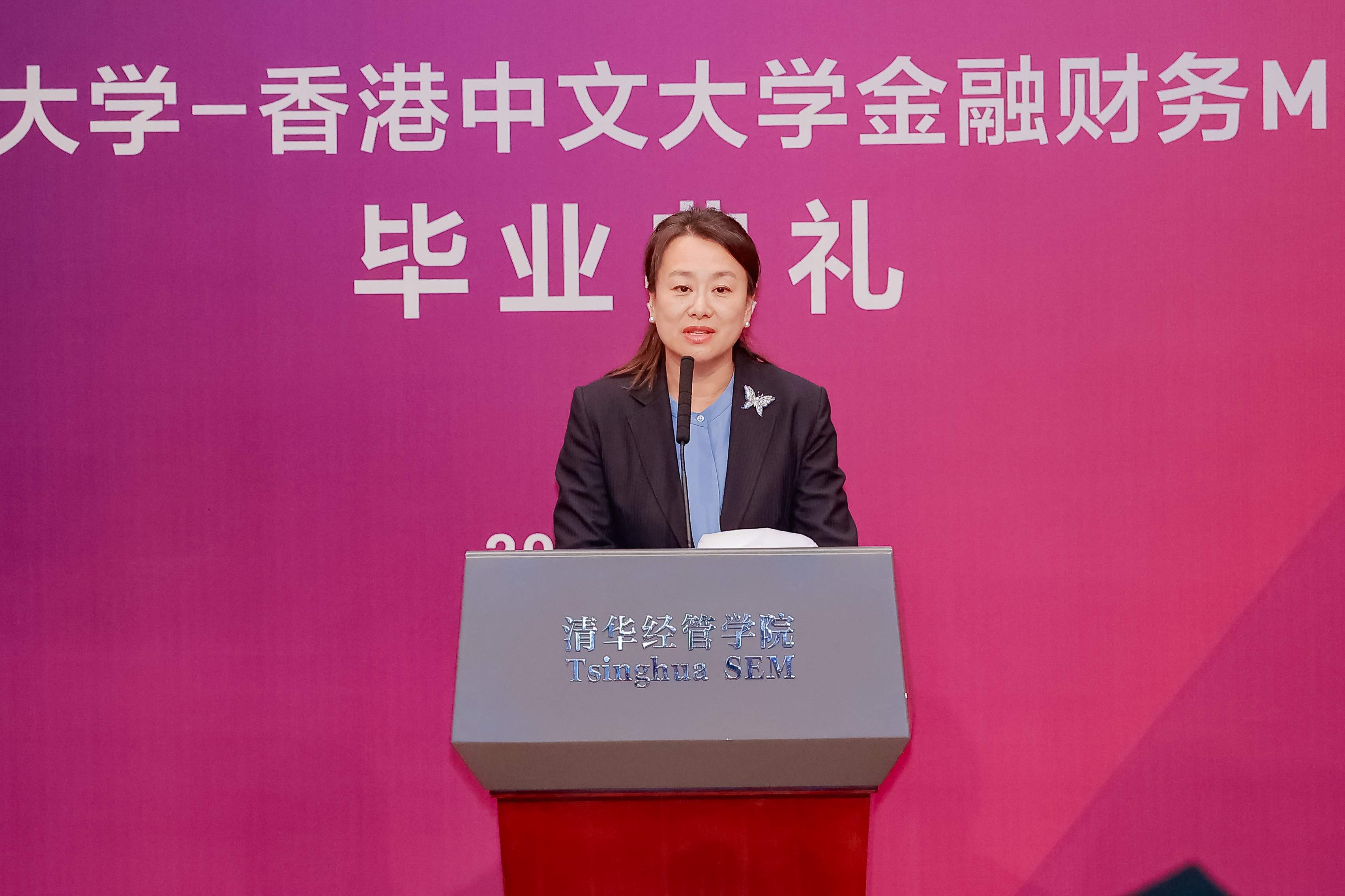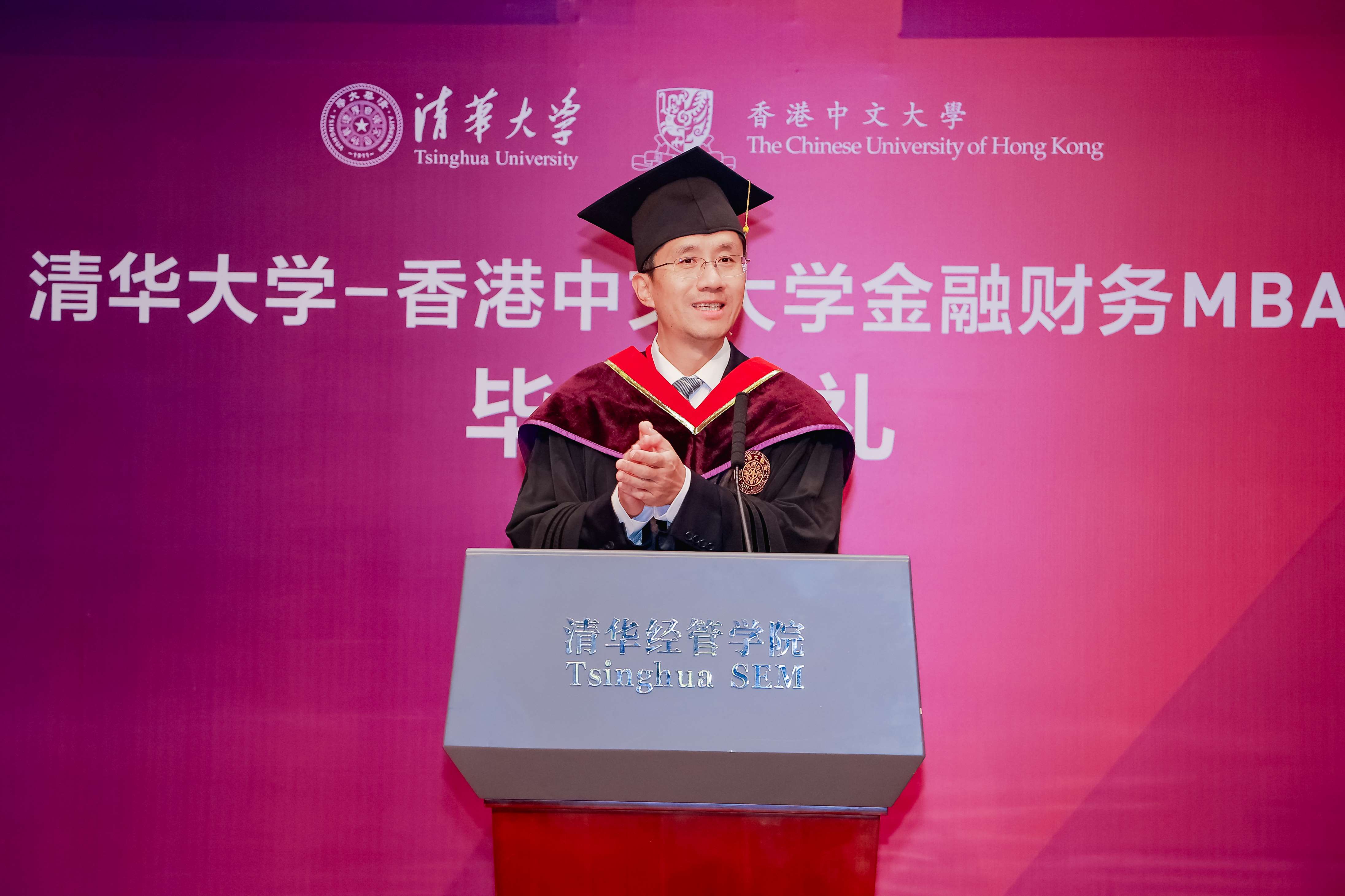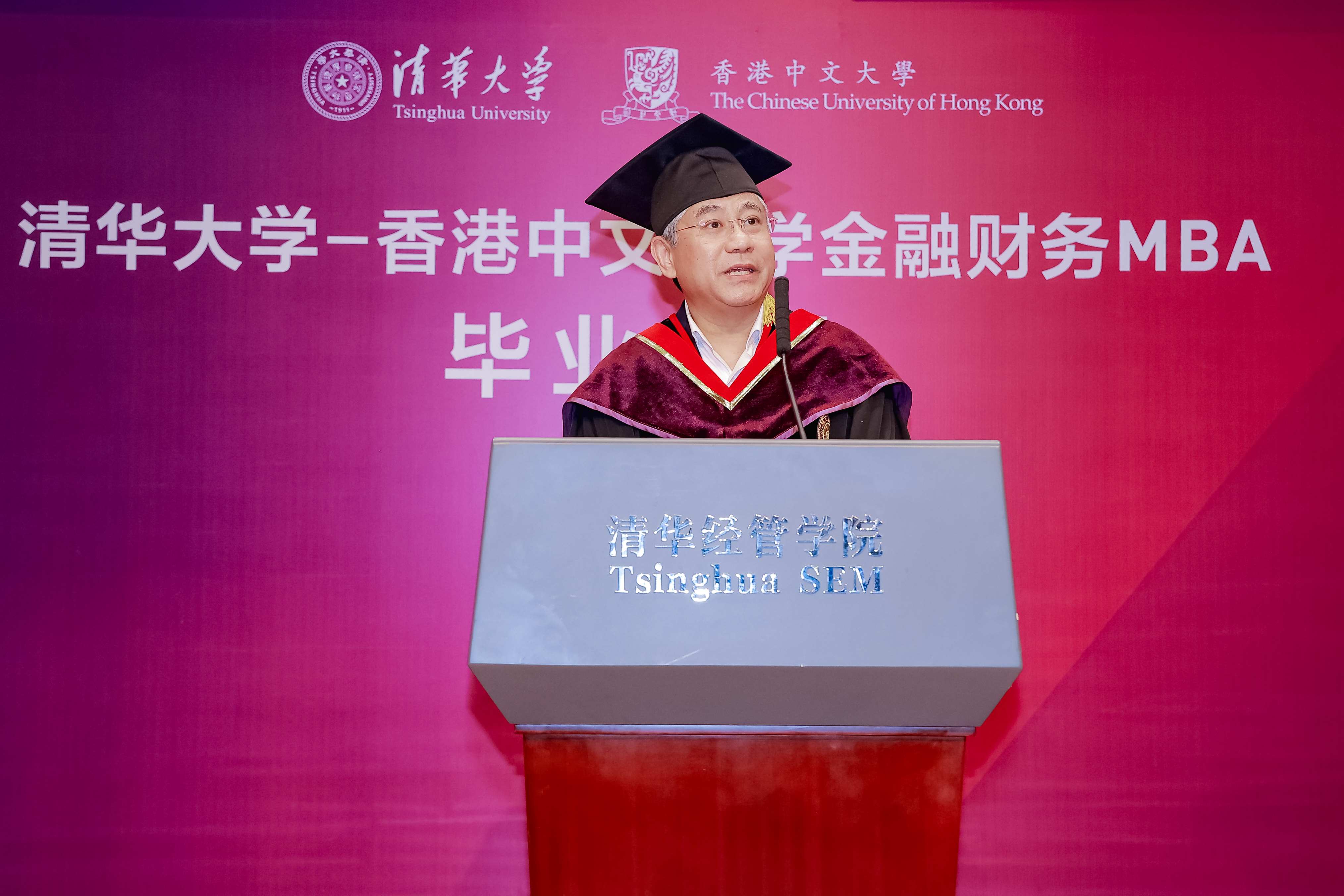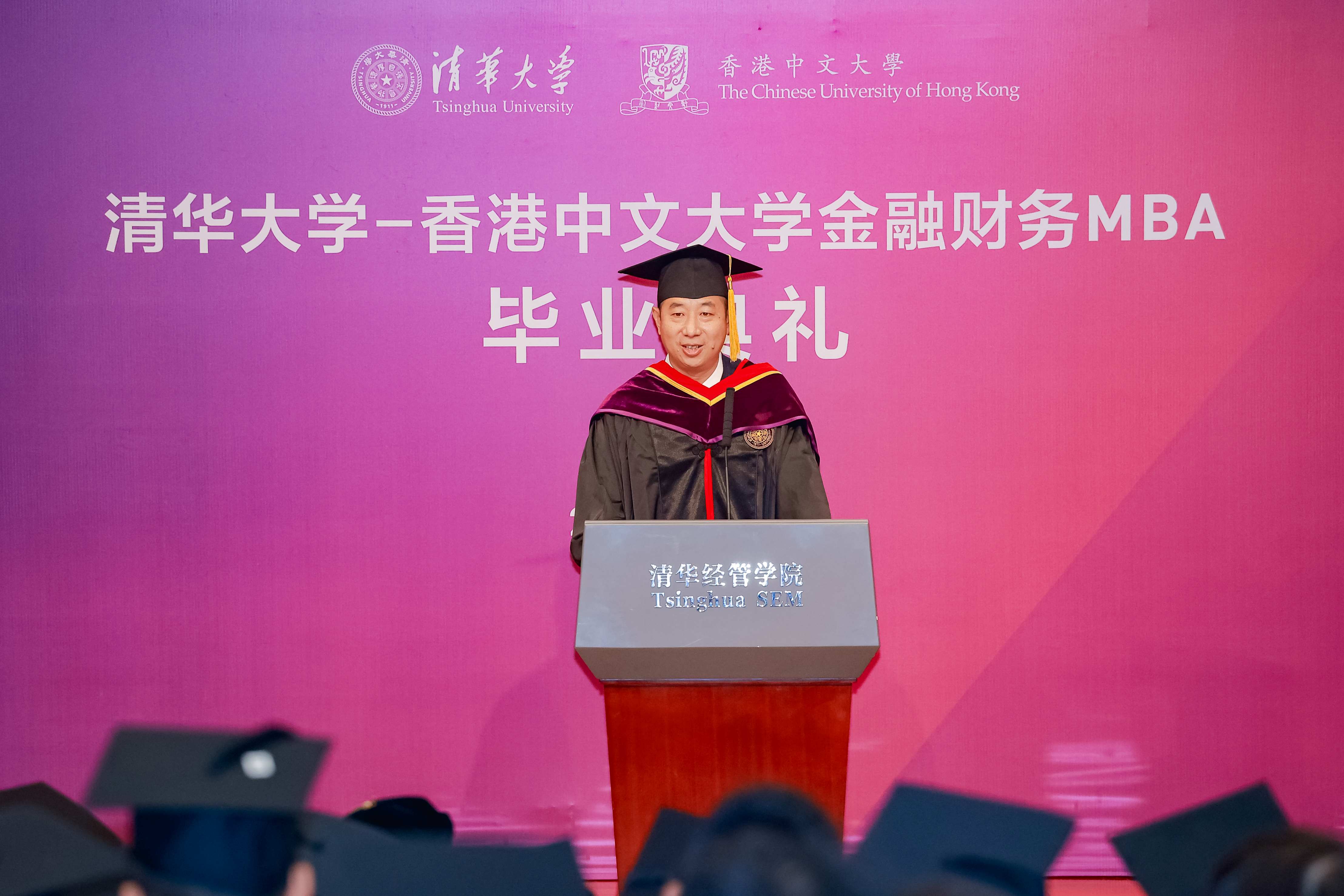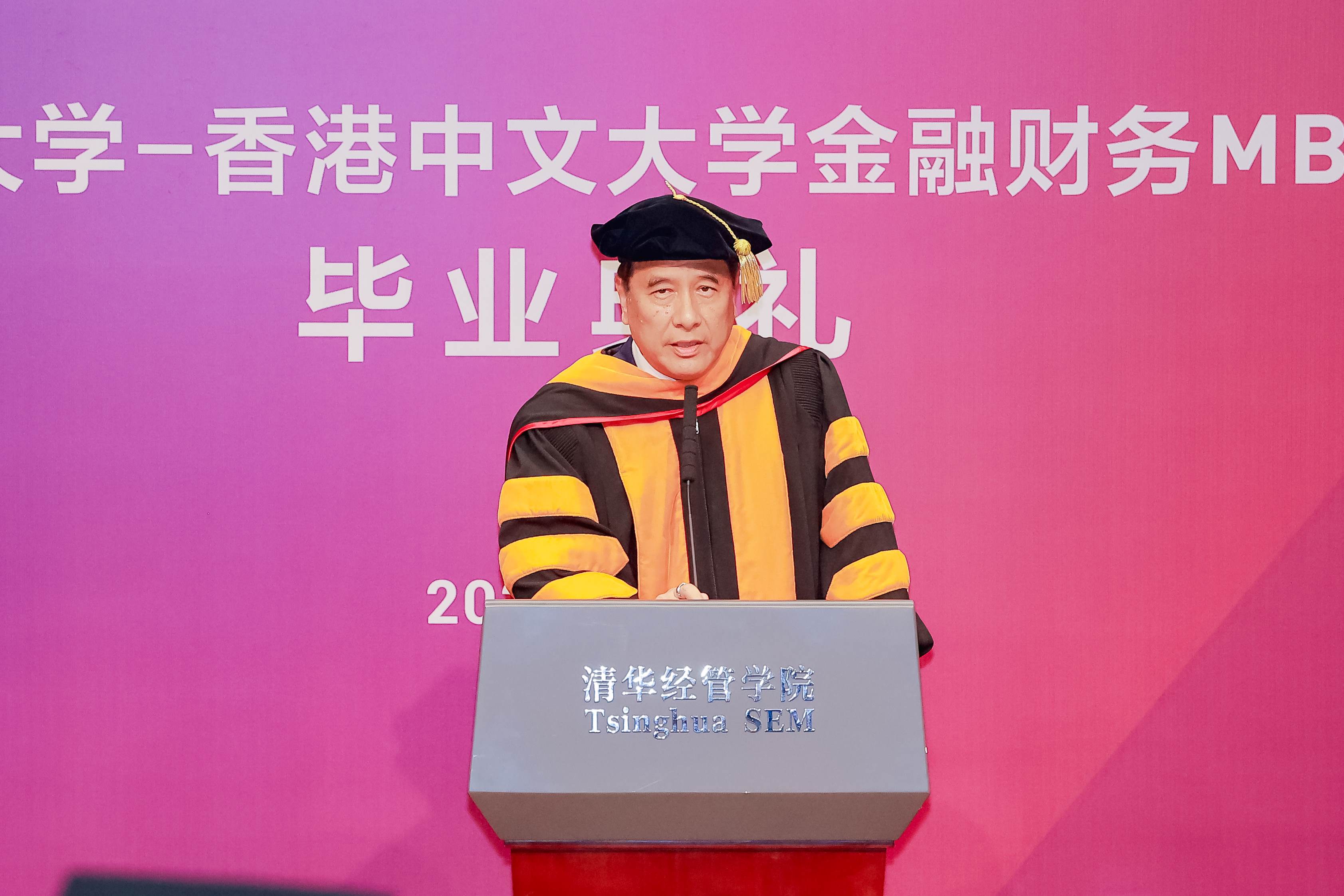 香港中文大学商学院院长周林致辞表示,今天不仅是同学们学业完成的重要时刻,也标志着两校合作的新起点。他回顾了两校项目合作办学的重要历程,对毕业生的未来职业发展与社会责任担当寄予厚望,同时期待毕业生在建设中国金融业的宏伟大业中发挥自身的专业力量。