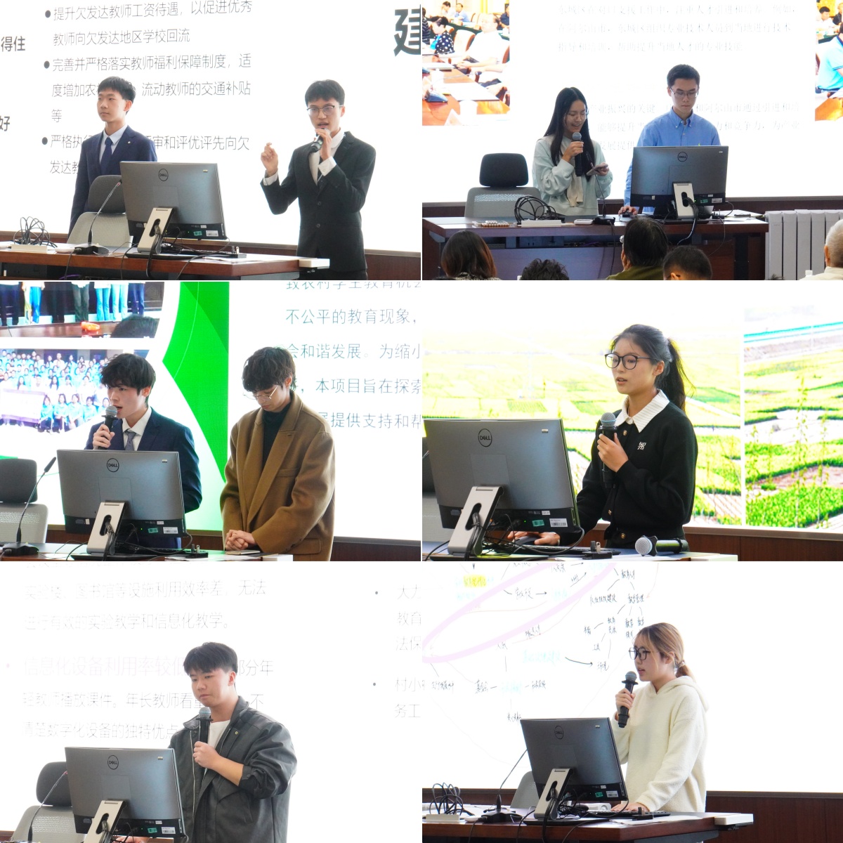随后是参赛项目展示环节,由各个参赛队伍进行项目展示与答辩。本次大赛共有6支队伍,围绕“产业现代化”或“教育现代化”主题进行展示与答辩,体现了同学们在公益活动中的思考,对未来公益项目改善方向的探索,加深了对公益创新的认识。