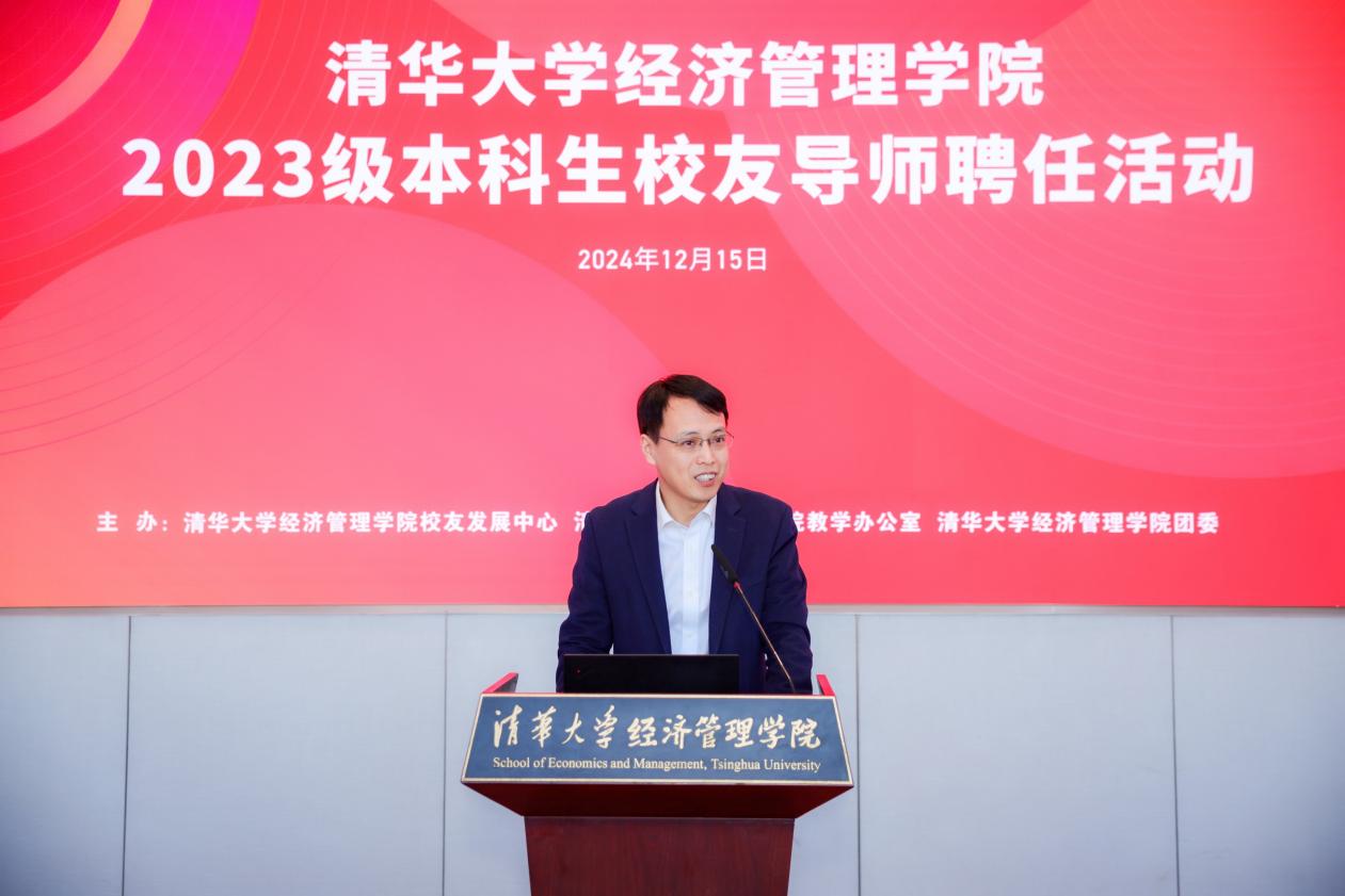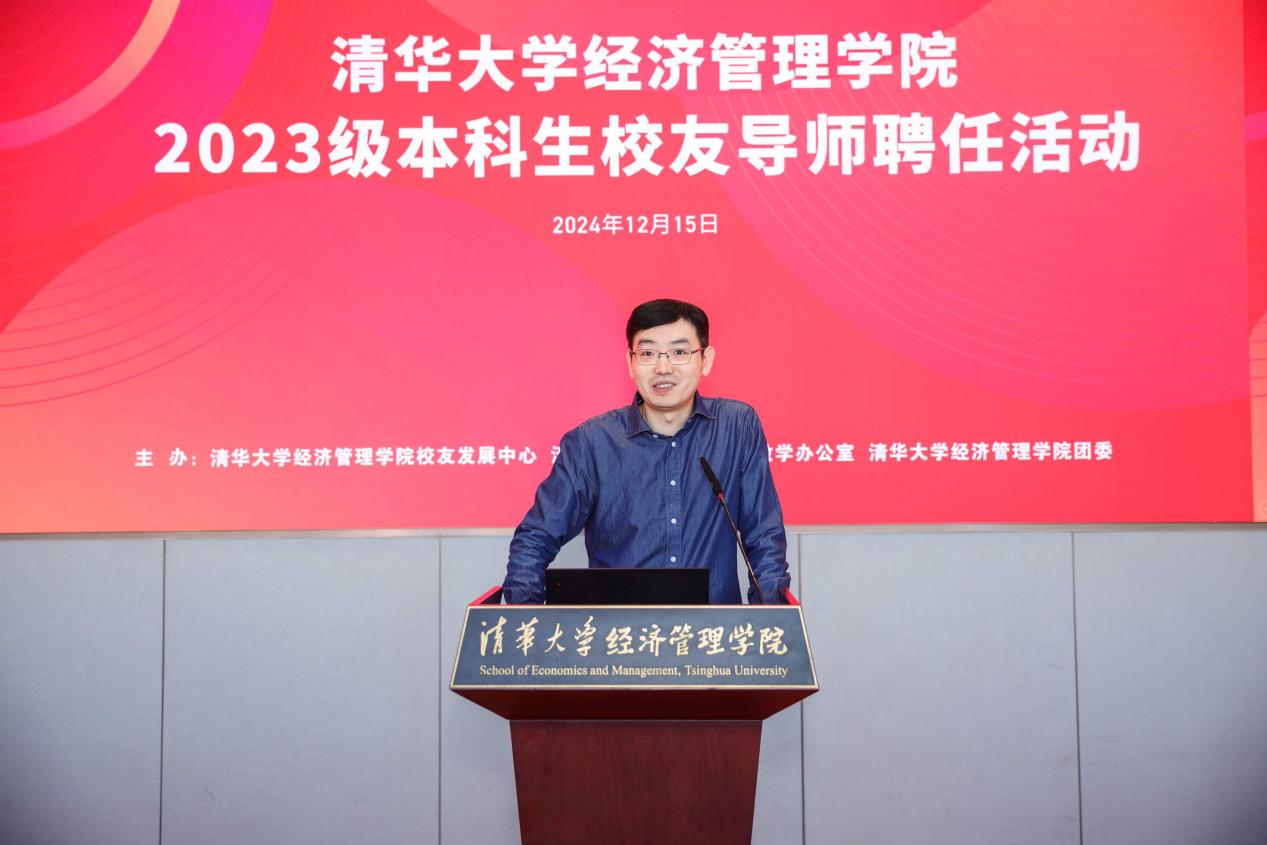 刘庆首先代表学院对校友导师表示欢迎,他指出,校友是清华的宝贵财富,校友的经验和指导对同学们的成长至关重要。当前世界经济环境的大变革中,同学们更需要来自多样化的赛道信息。2023级校友导师涉及业界、公共部门、学界等多个行业,能为学生的成长和学院的发展提供重要帮助。他鼓励同学们积极把握机会,主动与校友导师交流学习。最后,刘庆向各位心系母校、回馈学院的校友导师表示感谢。