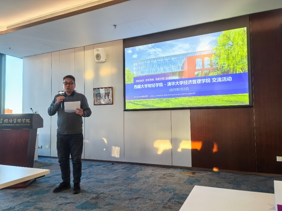 学院党委研究生工作组组长吴添首先对西藏大学财经学院到访师生致以热烈欢迎。他回顾了清华经管学院与西藏自治区的合作,介绍了学院师生前往墨脱等边疆地区开展志愿公益实践的情况,并期待双方以本次座谈会为起点,未来在其他领域进一步深化合作。