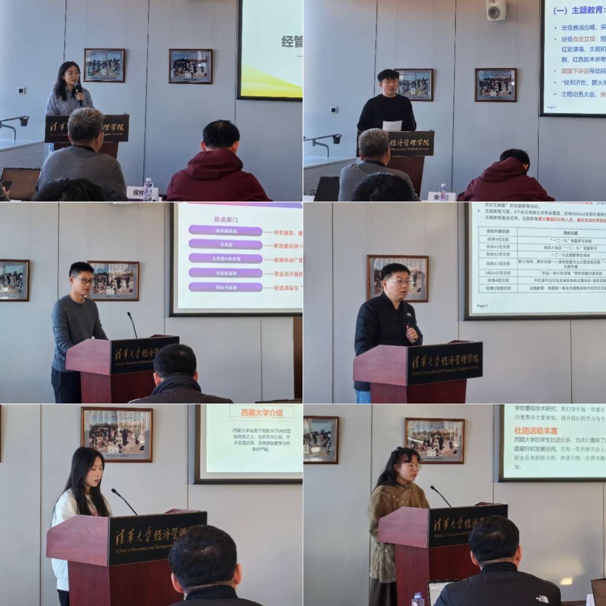 经管学院学生会副主席、2021级本科生胡雅婷从学业辅导、师生交流、文体建设、海外支持和外部合作等方面,介绍了学院学生会对本科生在学期间提供的系统性支持。经管学院团委副书记、2021级本科生韩一博从主题教育、班团建设、志愿公益、品牌实践、校友联络和骨干培养等方面,介绍了学院团委在助力本科生成长成才过程中的各项努力。经管学院研究生会主席、2023级硕士生贾欸从内部建设、导学思政、体育活动、文艺美育、学生权益和国际交流等方面,介绍了学院研究生会向全院研究生提供的个性化、特色化服务。经管学院研团总支书记、2023级博士生邹济从思想引领、党团建设、社会服务和就业引导等方面,介绍了学院研团总支在引领全院研究生提升思想觉悟、努力回馈社会中的各项工作。