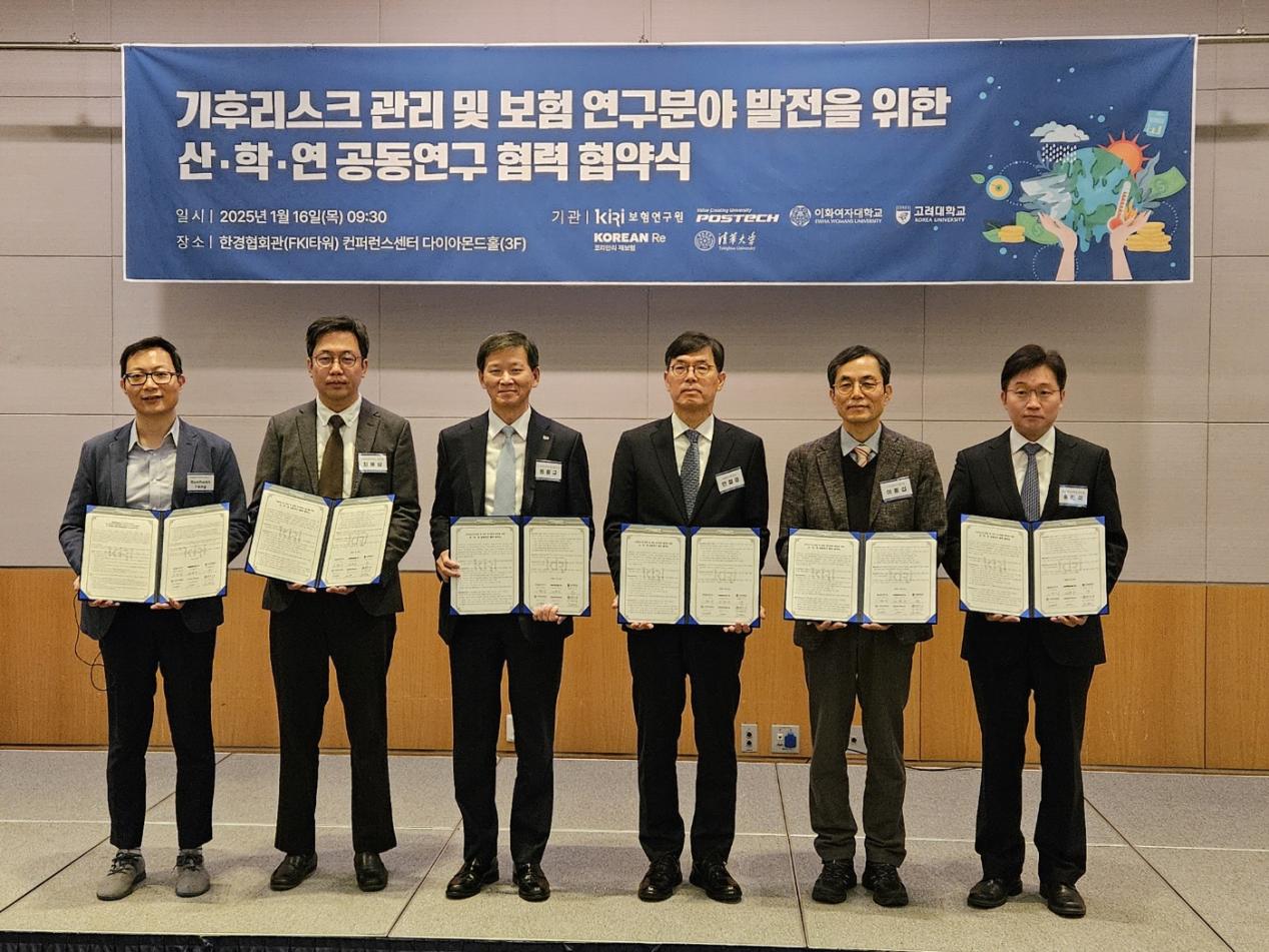 备忘录签署现场【左起:冯润桓、梨花女大气候与能源系统工程系教授崔永尚(Yongsang Choi),韩国再保险总经理元钟国(Jonggu Won),韩国保险学会会长安哲庆(Chulkyung Ahn)、高丽大学土木、环境与建筑工程学院教授李钟燮(Jongsub Lee),浦项科技大学工业与管理工程系教授宋珉锡(Minseok Song)】