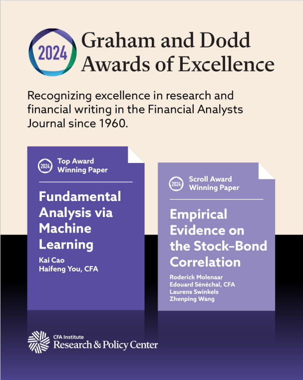 特许金融分析师协会每年都会从《金融分析师期刊》刊发的研究论文中评选出享有盛誉的格雷厄姆与多德卓越奖,旨在表彰获奖研究对投资管理实践作出的贡献。该奖项以本杰明·格雷厄姆(Benjamin Graham)和大卫·L·多德(David L. Dodd)的名字命名,以纪念他们为金融分析领域做出的重要贡献。该奖项最多颁发三个,一个"最高奖"(Top Award)授予最佳研究论文,两个"荣誉提名奖"(Scroll Award)授予优秀研究论文。