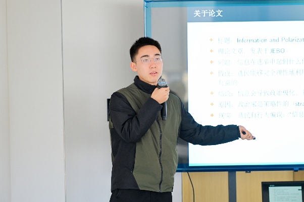 学术分享环节,2022级经济系博士生刘赞辉为大家分享自己发表高质量论文的经验感悟。他介绍说,他的论文是在2022年受到韩国大选新闻的启发,从而决定研究“信息在选举中起到的作用”这一选题。从2023年5月修改成稿,中间经历了投稿失败,转换投稿路线,反复修改文章,一直在2024年7月才被接收,8月见刊。刘赞辉表示,在撰写文章的过程中,选择合适的选题和研究方法是更关键的。同时他还分享了写作经验,通过对照成熟学者写出的标准文献,参照对方的格式以及行文的思路,来对自己的文章进行修改,在这个过程中能够大幅提升自己撰写学术文章的能力。