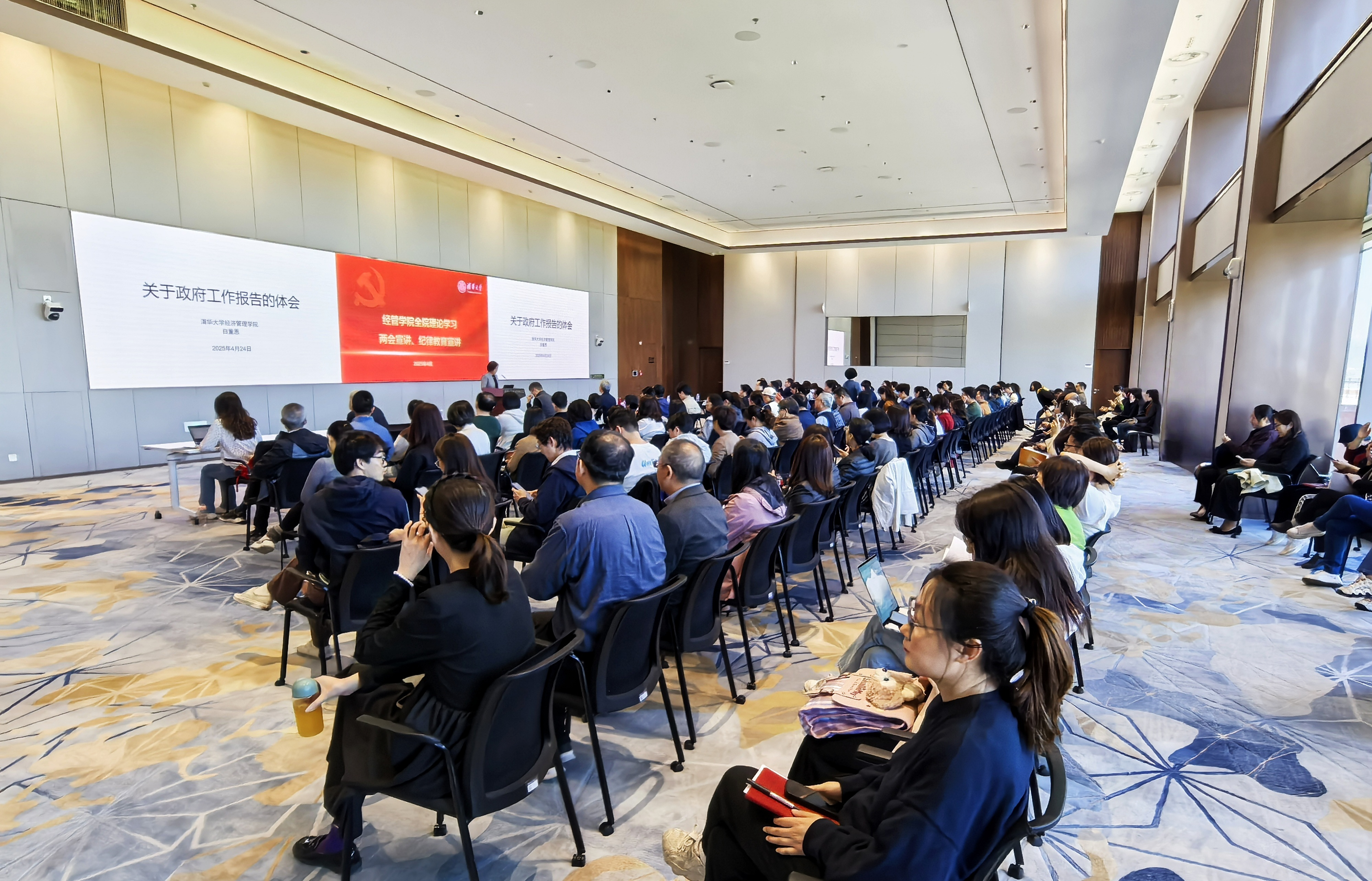 2025年4月24日,清华经管学院在建华楼召开全院理论学习会,深入学习领会2025年政府工作报告,同时进行纪律教育宣讲。全院教师、博士后、机关支部党员、各部门负责人以及学生骨干150余人参会。会议由学院党委书记薛健主持。
