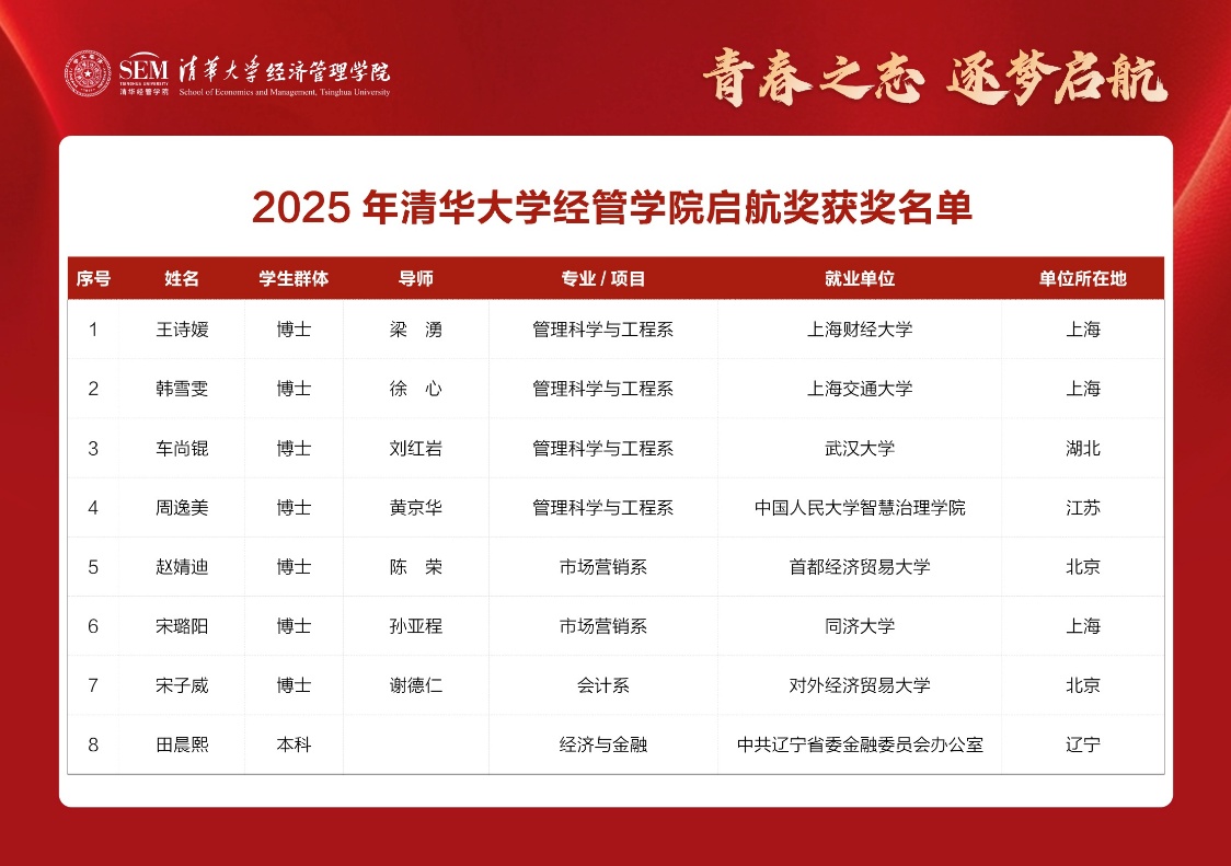 2025年6月19日,“清华经管学院启航奖”颁奖仪式举行。清华经管学院党委书记薛健,副院长徐心,党委副书记刘庆,院长助理迟巍,市场营销系教授、系主任孙亚程,管理科学与工程系教授刘红岩,市场营销系长聘副教授陈荣,党委学生工作组组长吴添、党委研究生工作组组长张佳音、职业发展中心主任顾英杰等出席本次活动。活动由迟巍主持。
