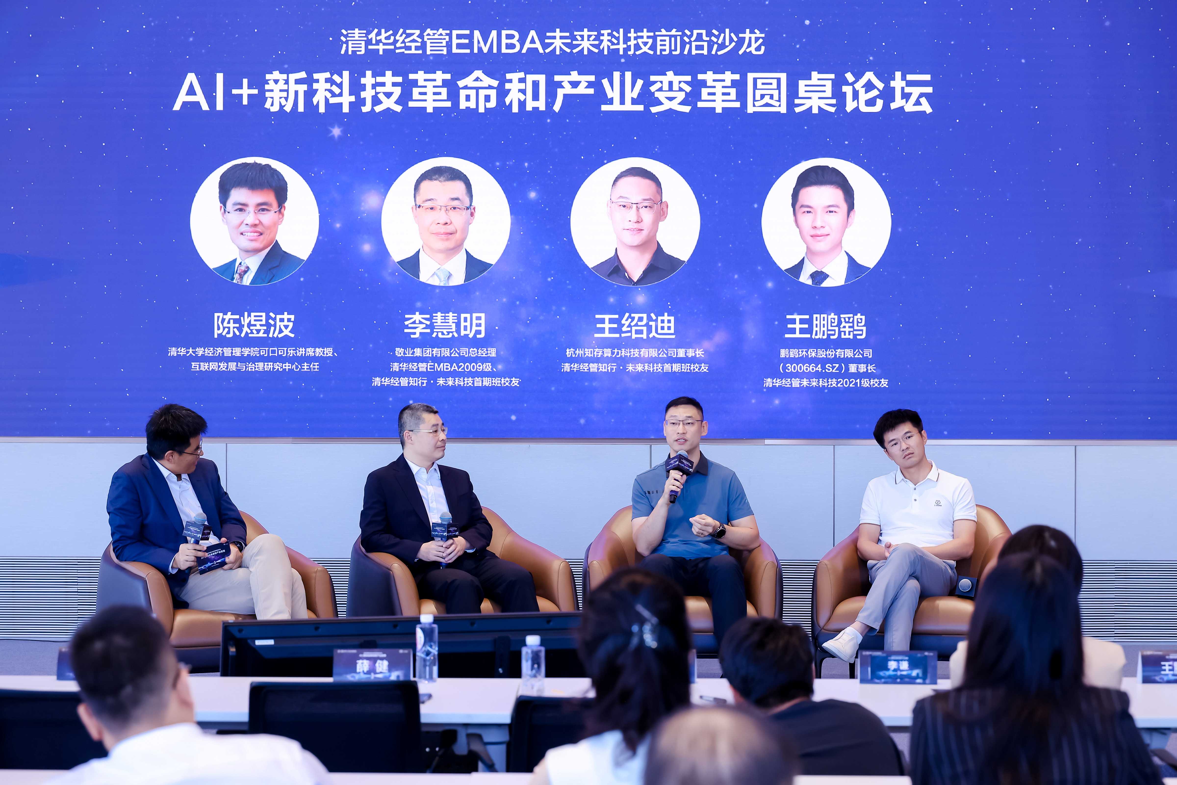圆桌论坛环节由陈煜波主持,他与清华经管EMBA2009级、清华经管知行·未来科技首期班校友、敬业集团有限公司总经理李慧明,清华经管知行·未来科技首期班校友、杭州知存算力科技有限公司董事长王绍迪,清华经管未来科技2021级校友、鹏鹞环保股份有限公司董事长王鹏鹞,围绕企业实践与AI应用展开深入对话。李慧明指出,当前钢铁行业正处减量发展与转型升级关键期,“高端化、智能化、绿色化”成为核心方向。他介绍,敬业集团在AI应用上多维度布局,推动企业向制造服务业转型。王绍迪介绍了“存算一体”芯片在人工智能算力发展中的突破意义。公司通过存算一体技术优化AI计算功耗和带宽,寻找技术突破口,努力在全球产业链中确立竞争优势。王鹏鹞认为,AI与环保的深度融合仍处于探索阶段,但已成为推动产业升级的重要方向。鹏鹞环保长期深耕水务处理,正聚焦水厂板块,通过转型装备主导模式、培养本地化AI小模型推动绿色发展。
