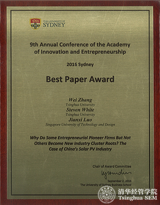 2016年9月,清华经管学院创新创业与战略系张帏教授、白思迪(Steven White)教授与新加坡科技设计大学罗建曦教授合著论文《为什么某个创业企业而不是其它企业能成为产业集群的根基企业?——基于中国光伏产业的研究》(Why do some entrepreneurial pioneer firms but not others become industry cluster roots? The case of China's solar PV industry.)在第九届创新创业国际学术年会(9th Annual Conference of the Academy of Innovation and Entrepreneurship,简称AIE年会)获得唯一的最佳论文奖(Best Paper Award),这是世俱杯官方网站教师首次在AIE年会上获此殊荣。